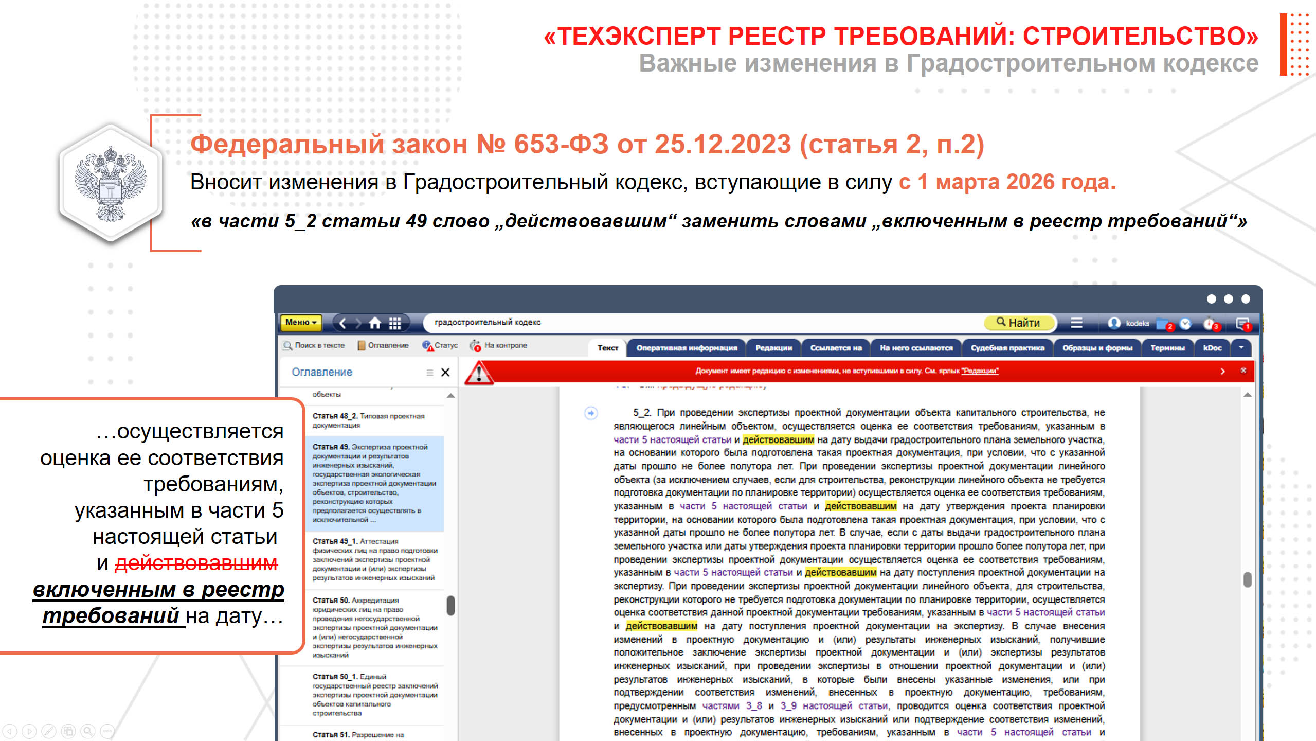 с 1 марта 2026 года в ч.5_2 ст. 49 Градостроительного кодекса будут внесены изменения на основании ФЗ от 25.12.2023 N 653-ФЗ. В соответствии с этими изменениями экспертиза проектной документации будет проводятся исключительно по требованиям официального Реестра на сайте Стройкомплекс.рф.