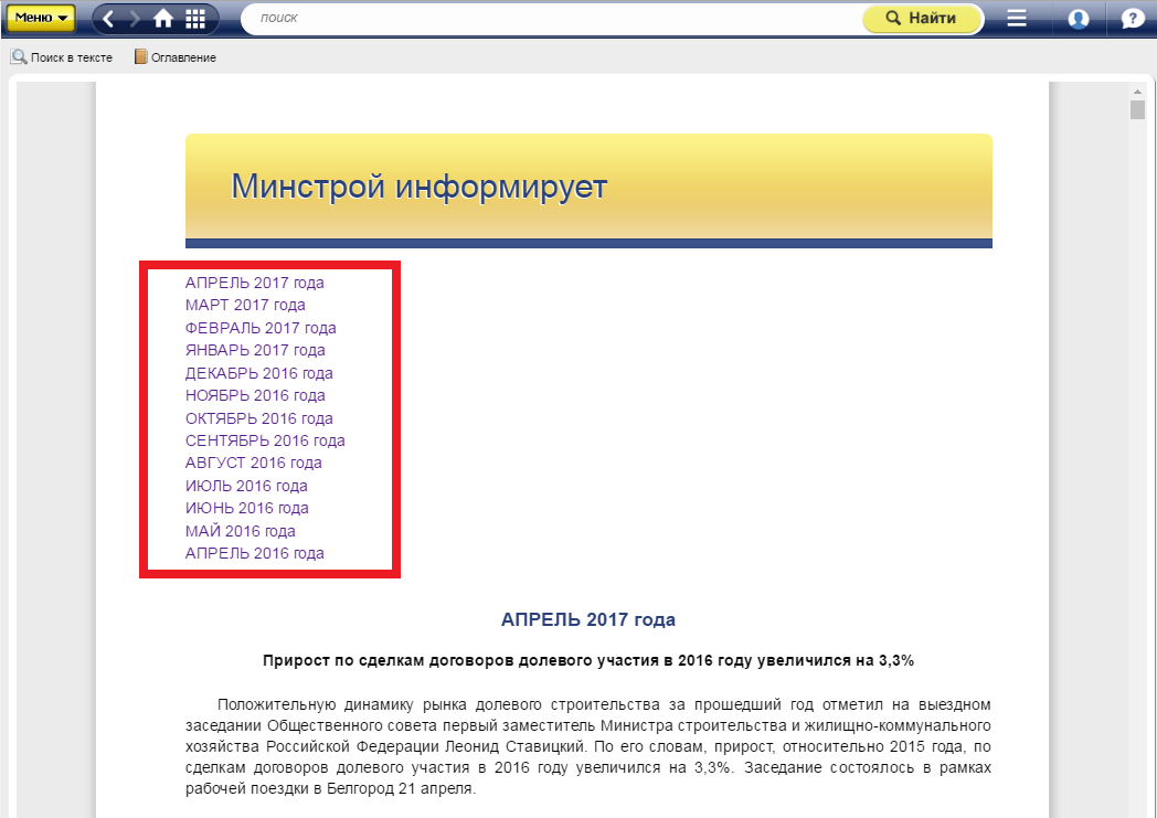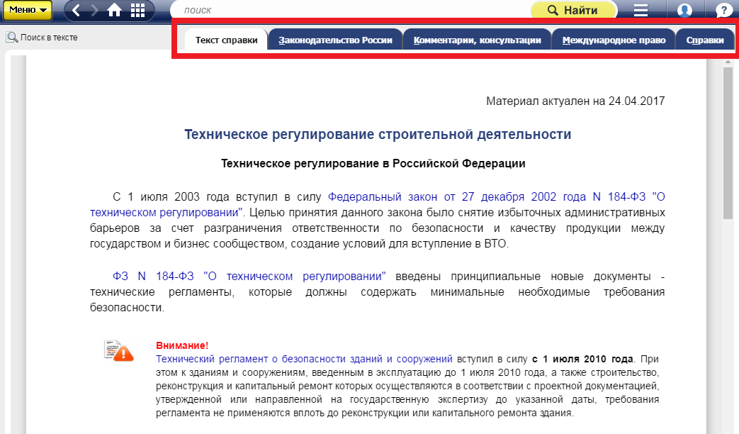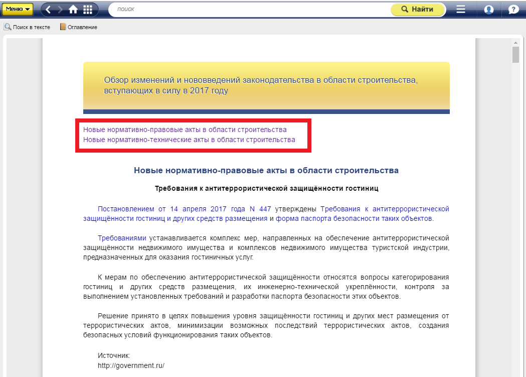 Информирует обо всех изменениях и нововведениях на 2017 год в сфере строительства. Специалист может быстро ознакомиться со всеми предстоящими изменениями, которые еще не вступили в силу, и, основываясь на этих знаниях, построить долгосрочные рабочие планы. Для удобства пользования вся база разбита на нормативно-правовые и нормативно-технические акты.