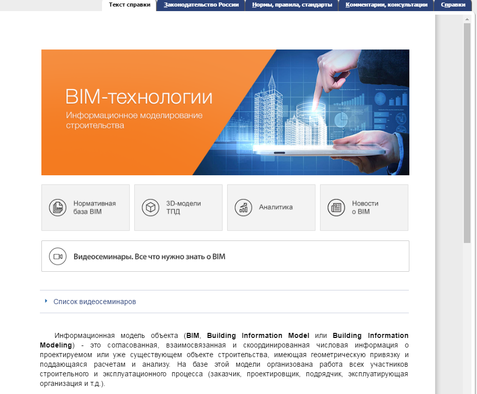 В разделе размещен подробный справочный материал о новой технологии информационного моделирования в сфере проектирования, в котором содержится: