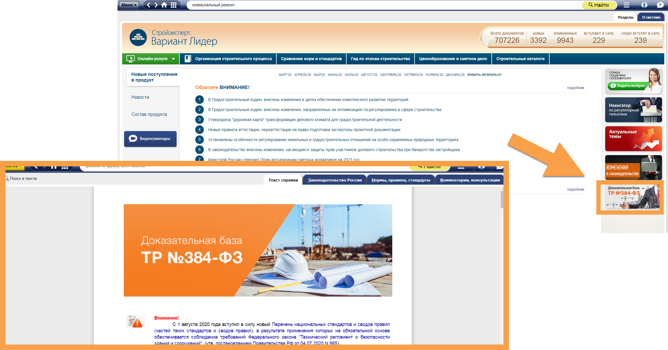 Детально ознакомиться со СП 368 и другими документами перечней ТР № 384-ФЗ можно через сервис строительных систем «Техэксперт» — «Доказательная база ТР № 384-ФЗ». Благодаря этому уникальному инструменту вы сможете: подробно изучить все требования, быстро определить обязательные к применению стандарты и СП, получить актуальную информацию о действующих нормах и избежать штрафных санкций.