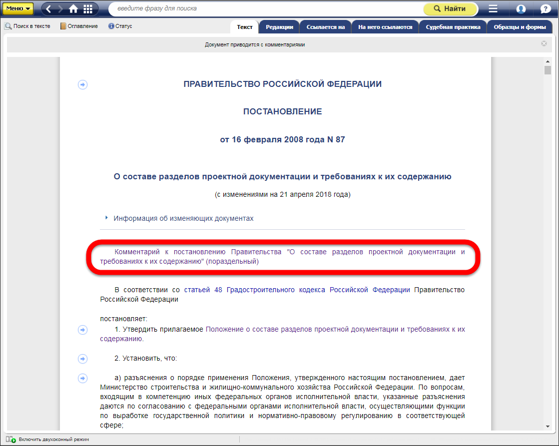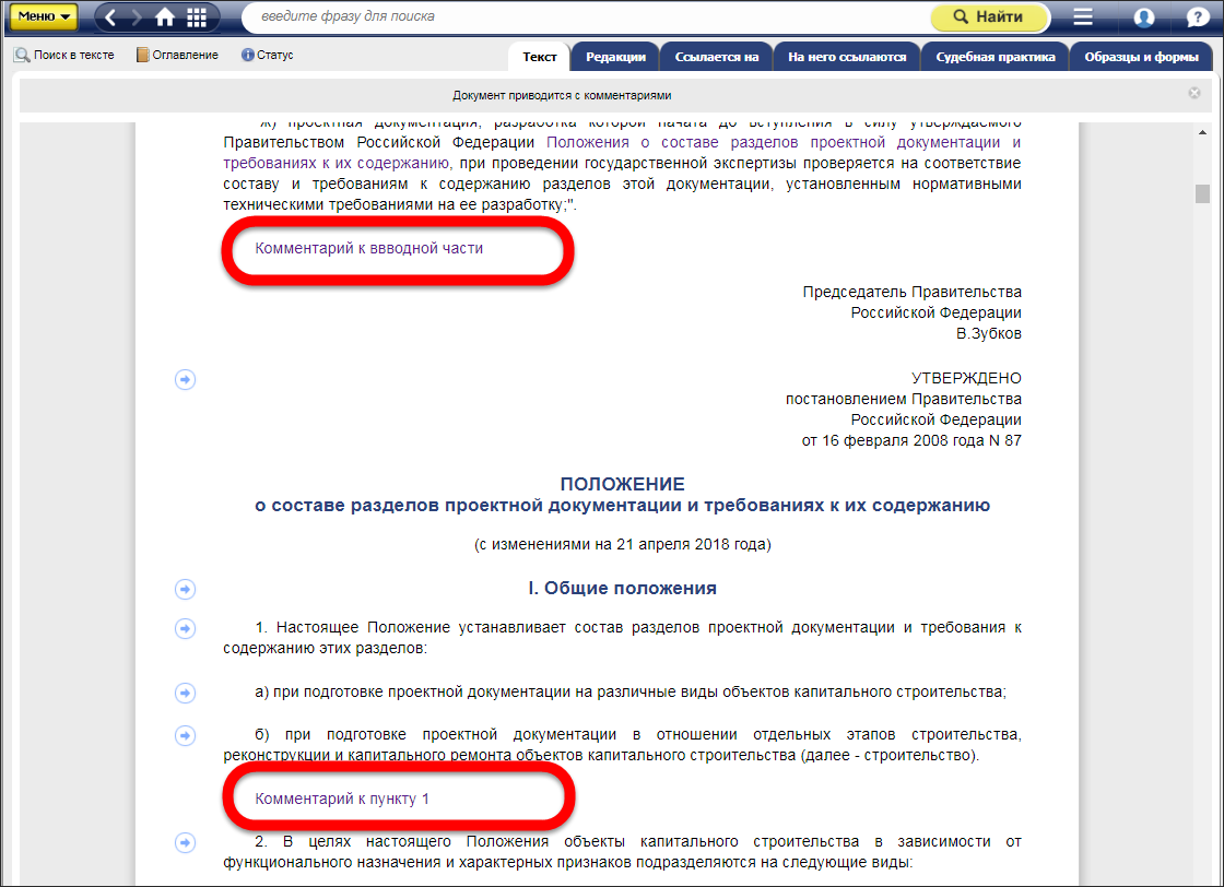 - воспользовавшись сервисом «Постановление № 87: комментарии экспертов» в системе «Техэксперт: Помощник проектировщика».