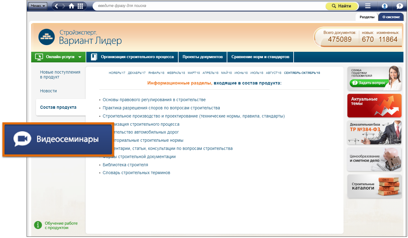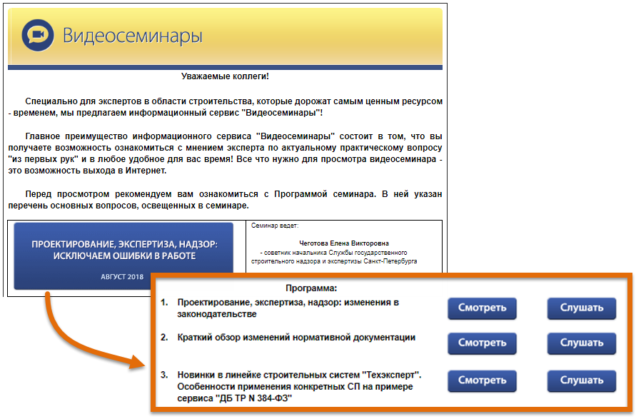 Они представлены на главных страницах строительных систем «Техэксперт» в сервисе «Видеосеминары».