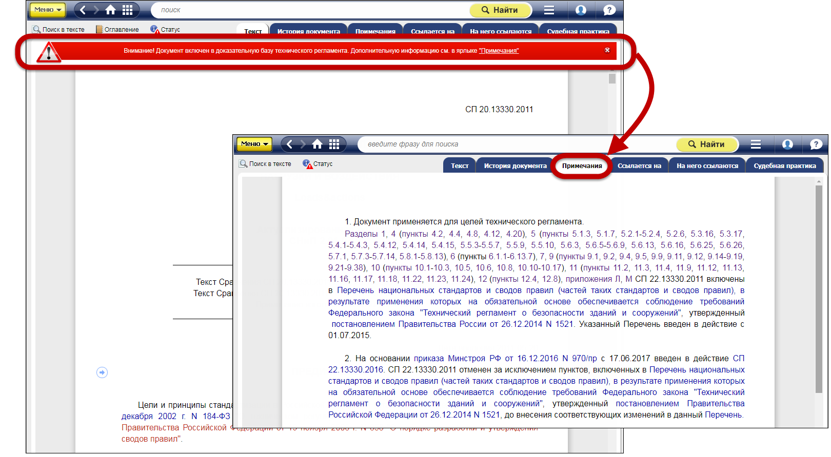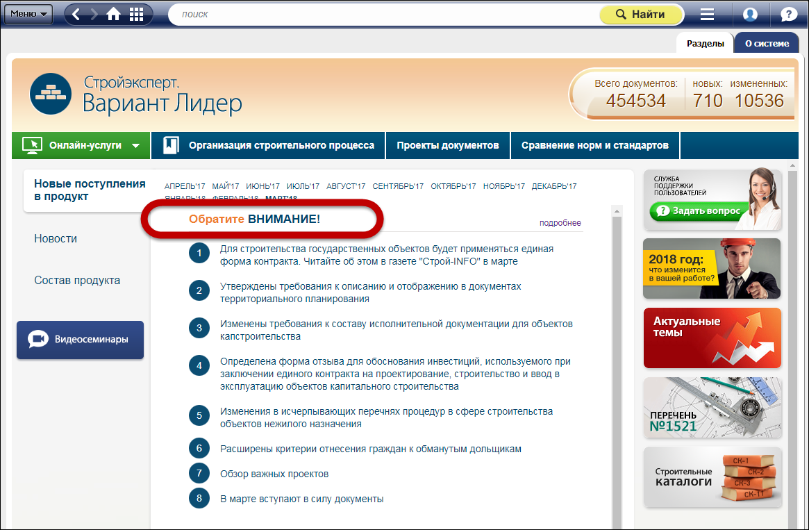 1. Сервис «Обратите внимание». Размещен на главных страницах всех систем и предоставляет подборку актуальных новостей со ссылкой на действующие законы. Так, вы можете не только ознакомиться со всеми нововведениями строительной отрасли, но и разобраться в их законодательной основе.