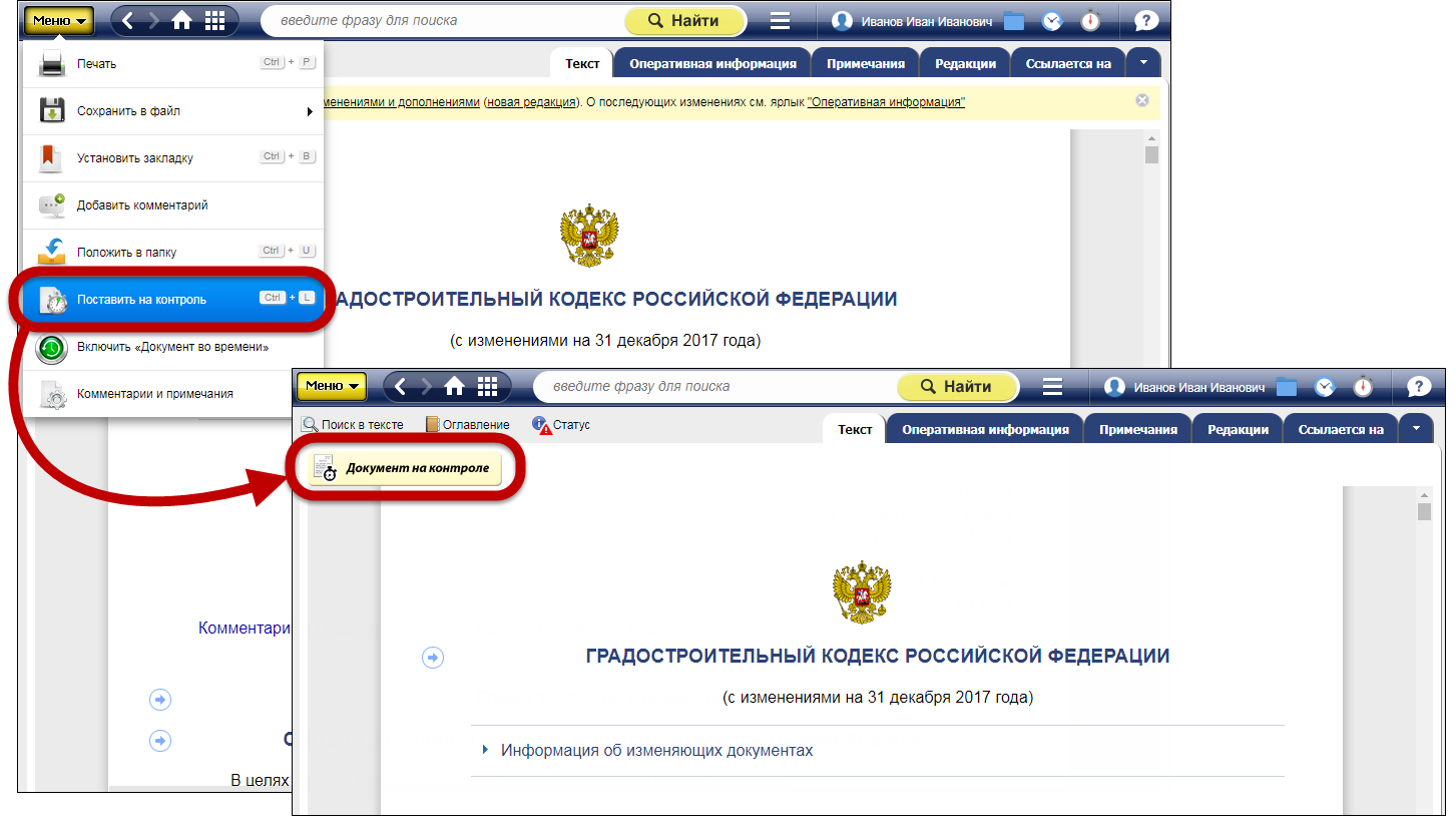 - поставить на контроль любые правовые акты федерального законодательства, нормативно-технические документы, судебные акты высших судебных органов РФ, формы.