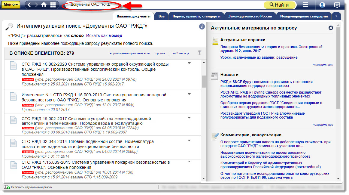 Обратите внимание! Документы выбирались с учетом запросов проектных организаций структуры «РЖД» и специалистов по производству работ, в том числе по ремонту и обслуживанию объектов железнодорожного транспорта, подвижного состава. То есть востребованность документов обусловлена реальными запросами пользователей систем.