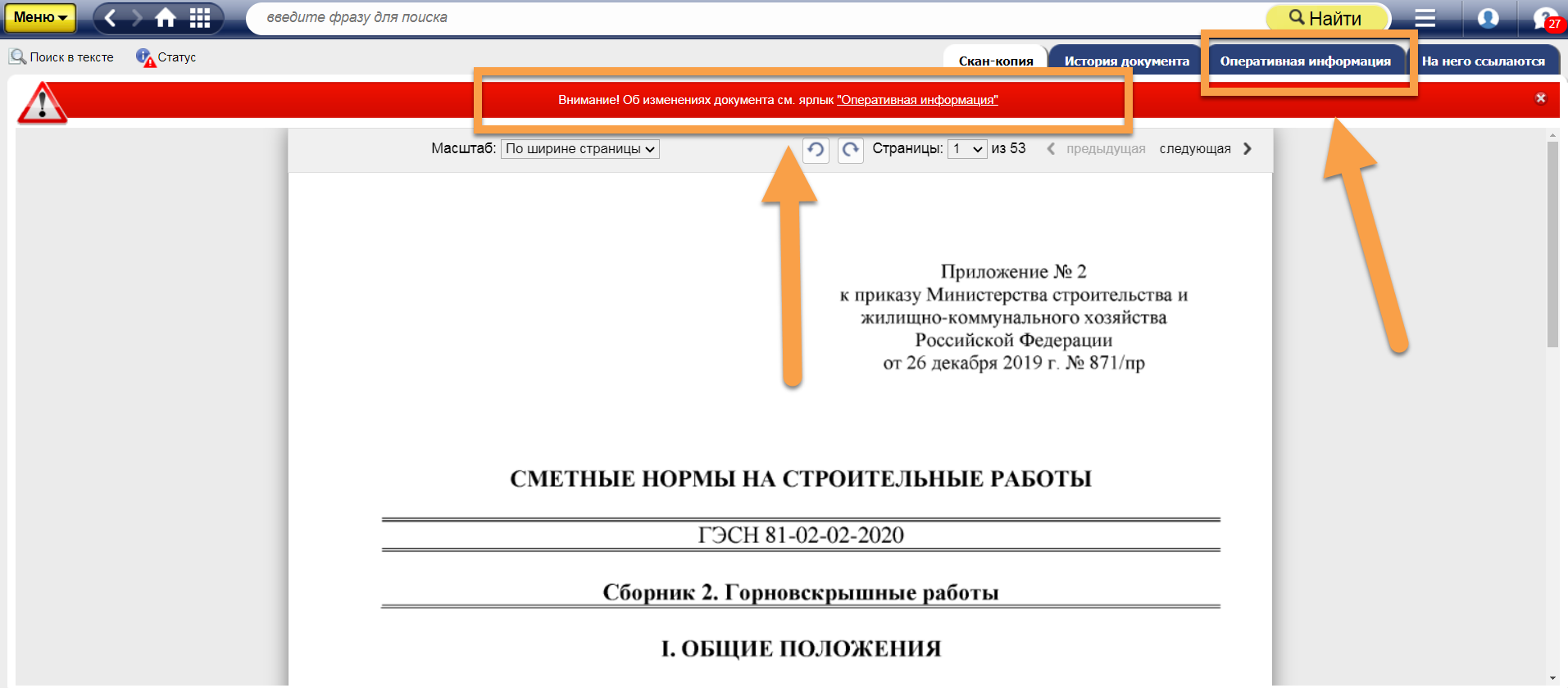 Если документ был изменен, то сверху появится строка красного цвета, а справа — ярлык «Оперативная информация», где можно получить комментарии о нововведении.