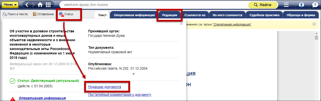 Просто откройте текст 214-ФЗ, нажмите кнопку «Статус» или перейдите на вкладку «Редакции» и применяйте сервис в вашей работе!
