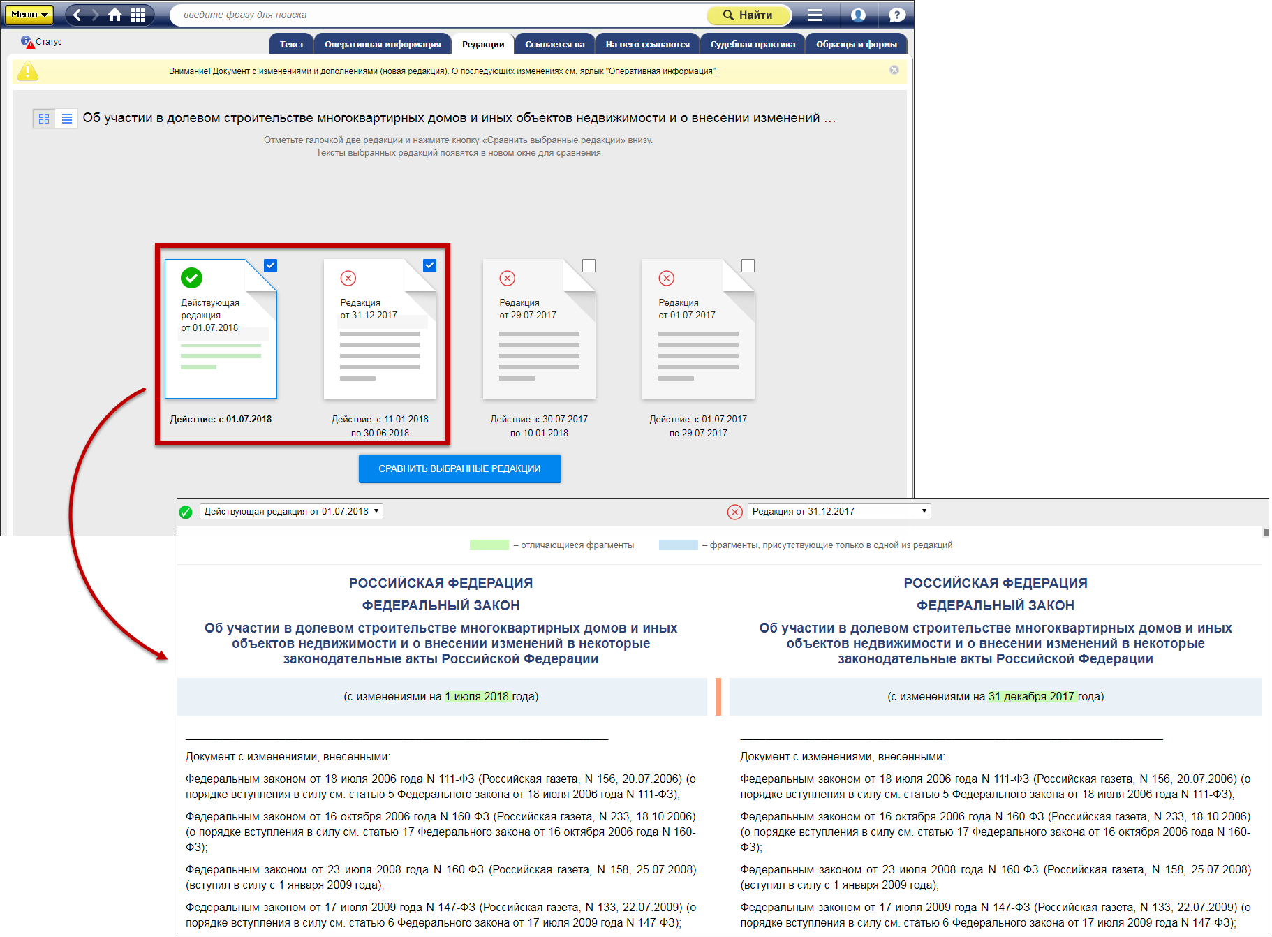 Оперативно ознакомиться со всеми поправками, внесенными в закон о долевом строительстве, поможет уникальный инструмент линейки строительных систем «Техэксперт» — сервис «Сравнение редакций».