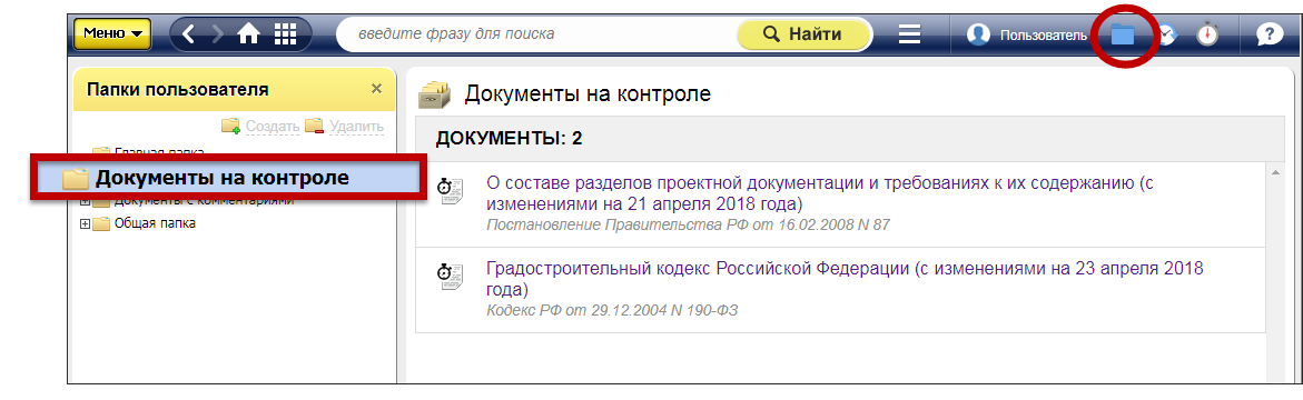 Более подробно ознакомиться с правками и изучить полный текст измененного документа вы можете под кнопкой «Папки пользователя», которая доступна на панели инструментов.