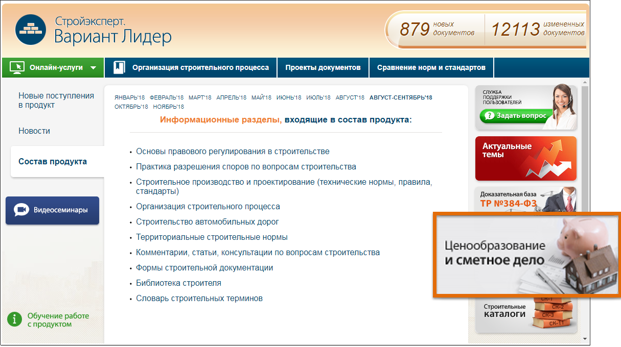 Сервис «Ценообразование и сметное дело» доступен на главных страницах профессиональных справочных систем «Стройэксперт. Вариант Лидер» и «Техэксперт: Помощник проектировщика».