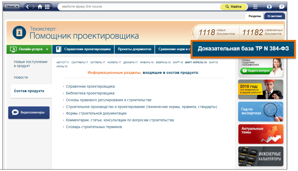 В строительных системах «Техэксперт» доступен уникальный сервис «Доказательная база ТР № 384-ФЗ», который предоставит вам подробную справочную и аналитическую информацию по всем национальным стандартам и СП из ТР № 384-ФЗ.