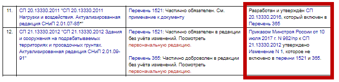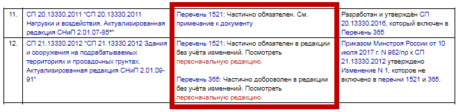 - примечания к каждому стандарту и СП (о наличии частичных изменений в документе, о его новой редакции в целом и т.д.);