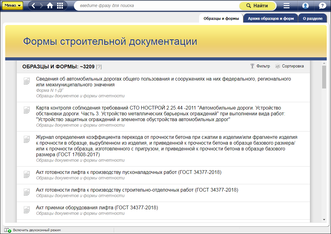 Оба раздела («Формы строительной документации» и «Образцы и формы документов в области дорожного строительства») включают в себя: