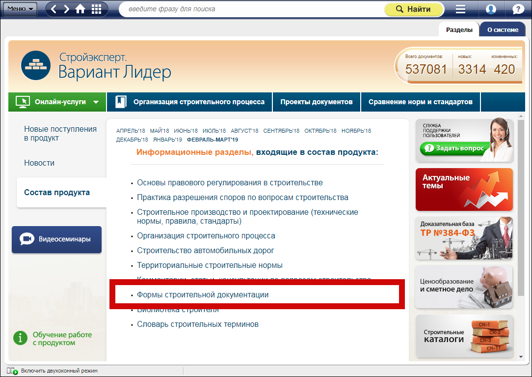 В линейке строительных систем «Техэксперт» представлен уникальный раздел «Формы строительной документации», предназначенный для специалистов, в ежедневные обязанности которых входит составление строительной документации. Раздел содержит более 3,5 тыс. примерных и типовых форм документов, утвержденных различными органами власти. Так, в разделе доступны формы: