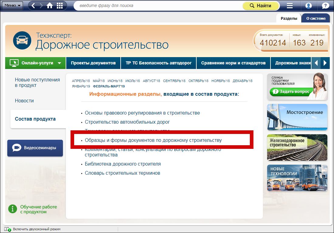 В системе «Техэксперт: Дорожное строительство» представлен специализированный раздел «Образцы и формы документов в области дорожного строительства», содержащий образцы и формы документов, которые находят применение в деятельности предприятий и организаций дорожного строительства.