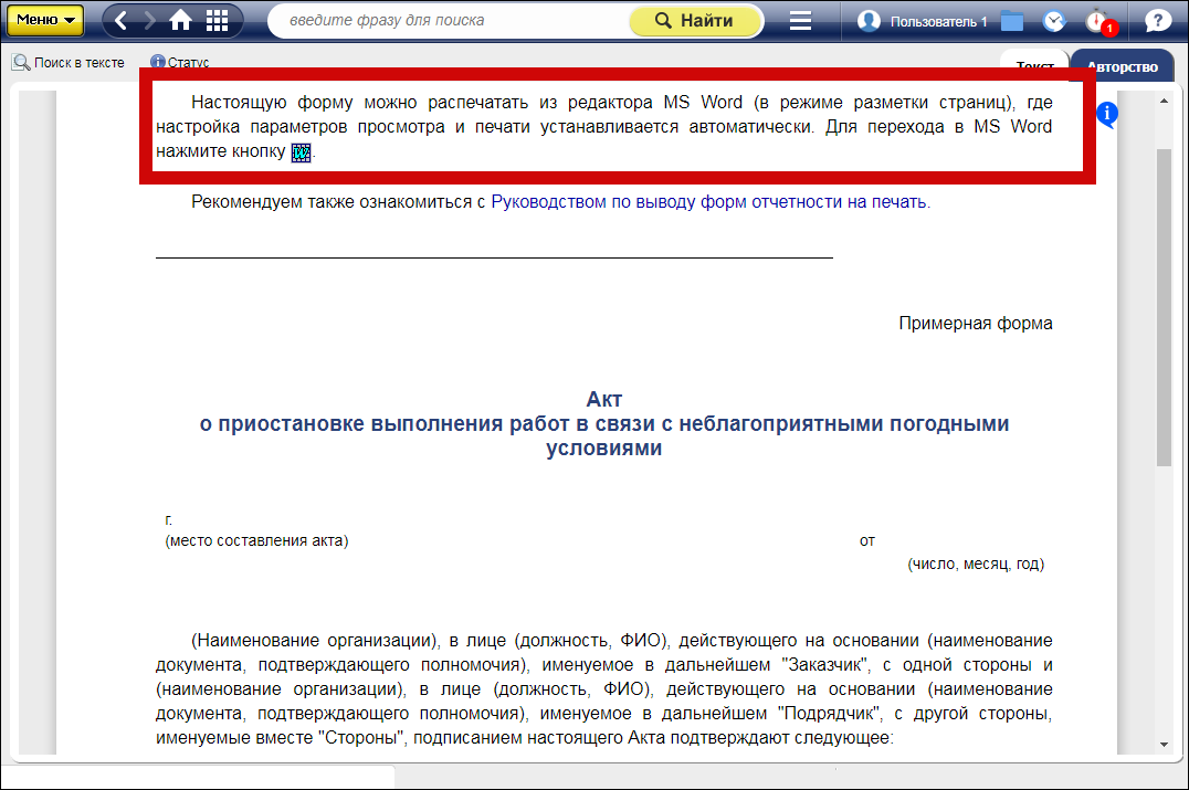 Для работы с оригиналами форм или образцов в MS Word/ MS Excel необходимо нажать кнопку «Получение оригинала MS Word/ MS Excel» (располагается перед текстом формы или образца). При этом настройка печати и просмотра документа устанавливается автоматически.