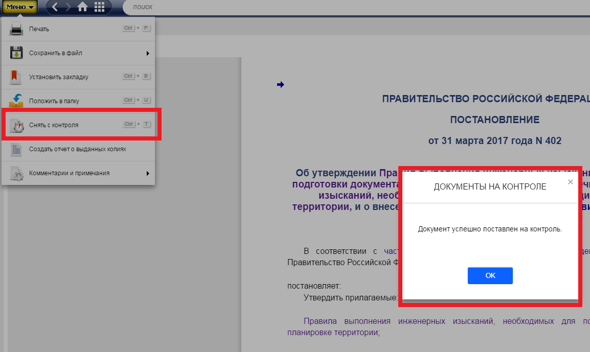 - поставить на контроль любые правовые акты федерального законодательства, нормативно-технические документы.