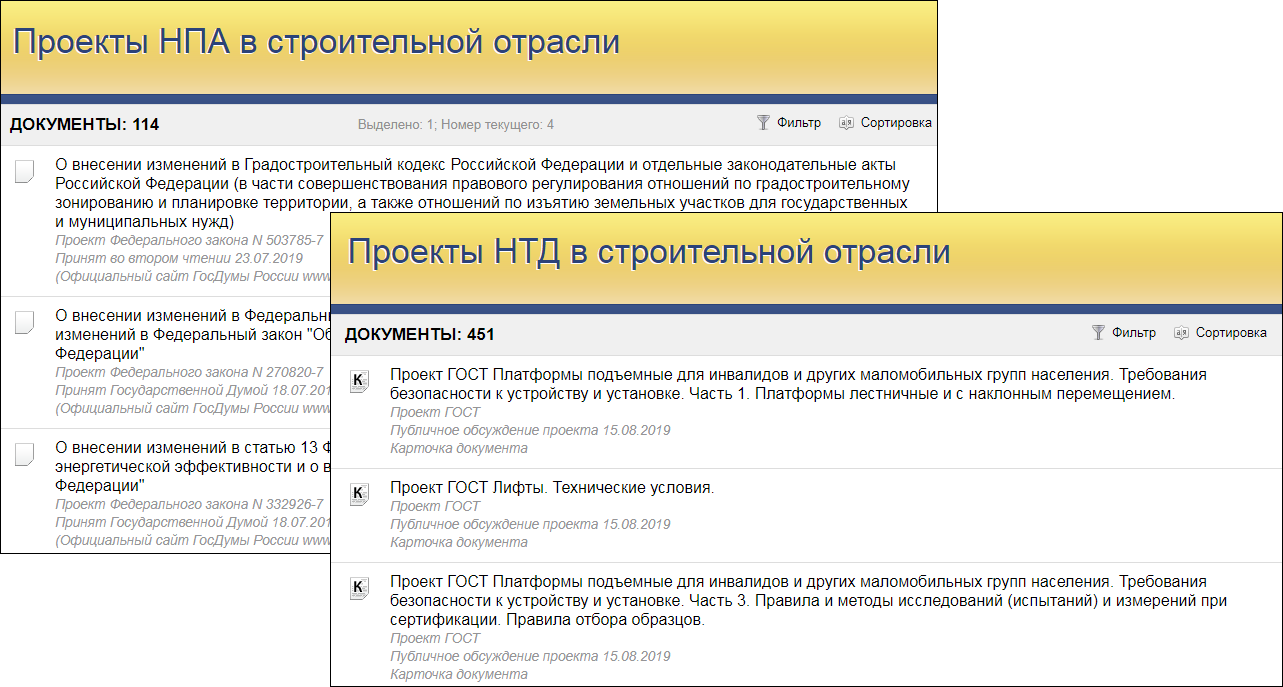 Сервис «Проекты документов» предоставляет вам достоверный и полный комплекс информации о проектах нормативных актов в сфере строительства и проектирования. Так, сервис содержит: