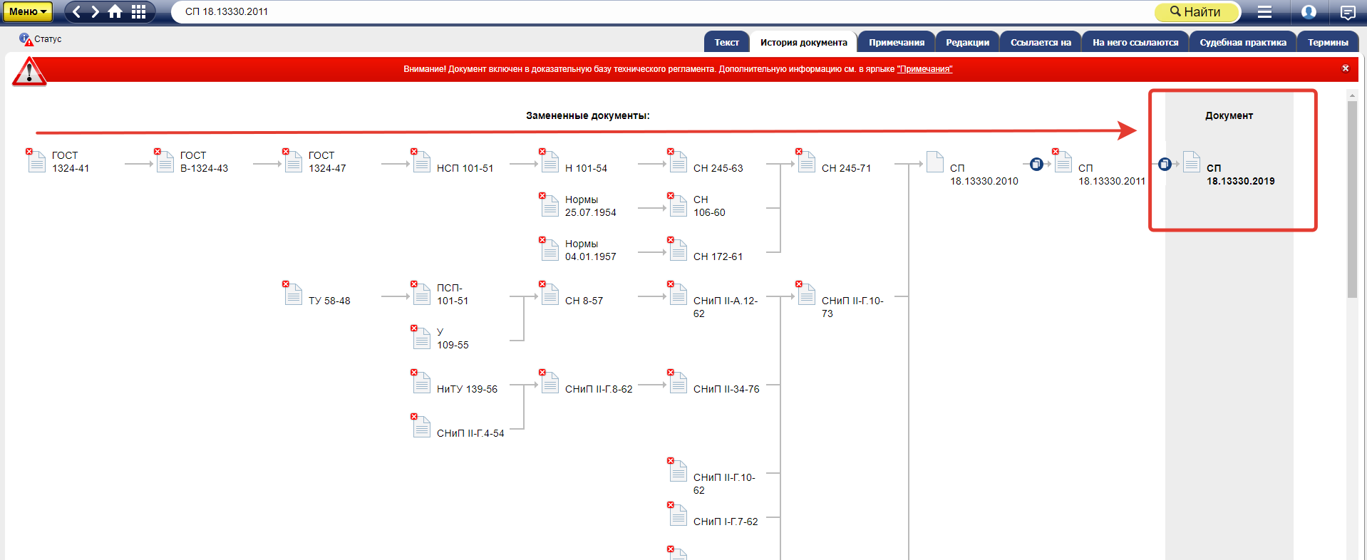 «История документа» предоставляет всю необходимую информацию об истории документа, о документах, действующих взамен и действовавших ранее.