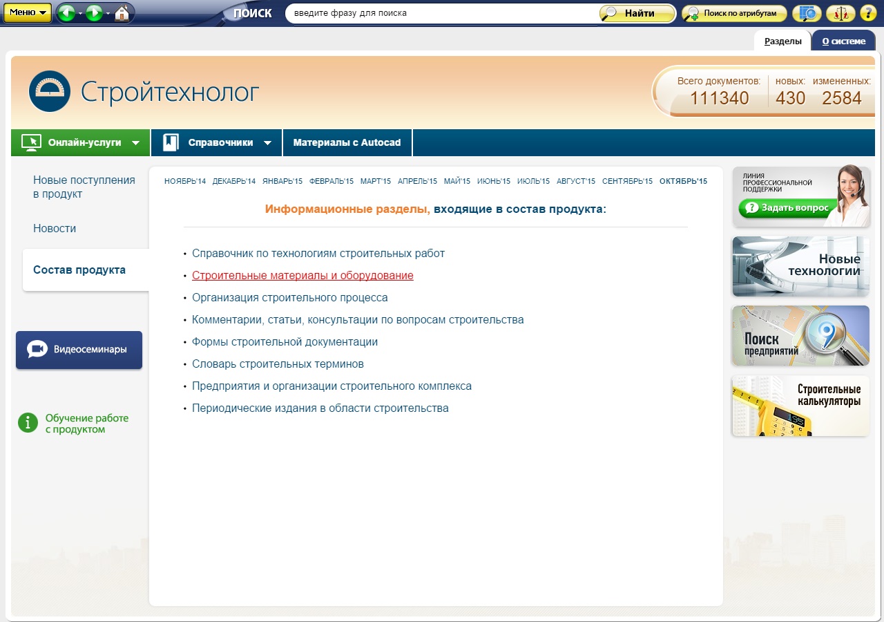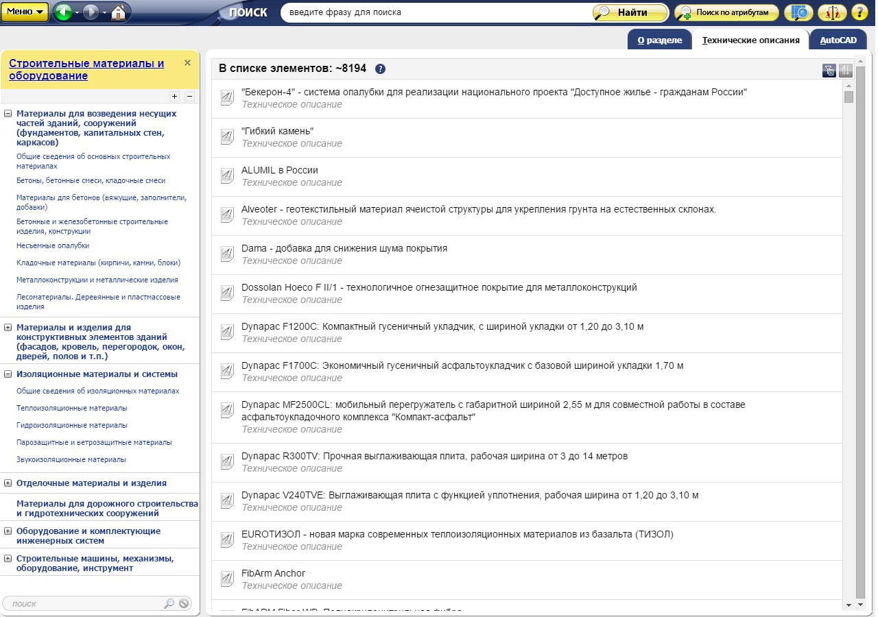 В системе «Стройтехнолог» в разделе «Строительные материалы и оборудование» вы легко найдёте всю важную информацию по строительным материалам, изделиям, машинам и оборудованию, используемом в процессе строительства, а именно: