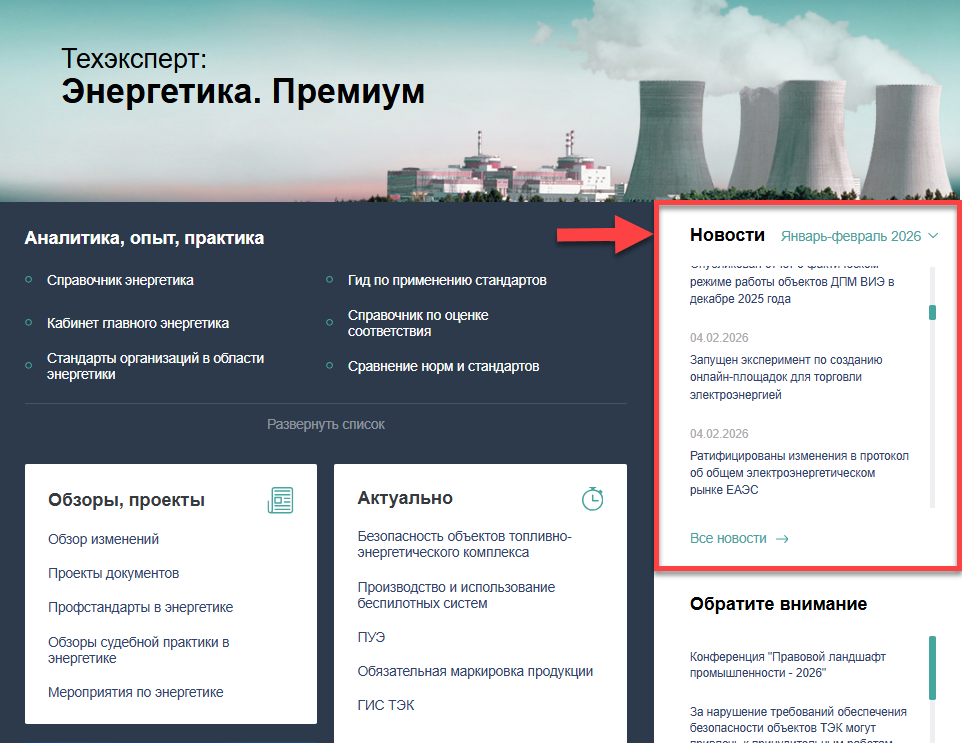 Быть в курсе последних новостей в энергетической отрасли поможет новостная лента, представленная в системах «Техэксперт: Энергетика. Премиум», «Техэксперт: Электроэнергетика», «Техэксперт: Теплоэнергетика». А в разделе «Обратите внимание» эксперты собирают для вас информацию о главных новостях и событиях месяца!