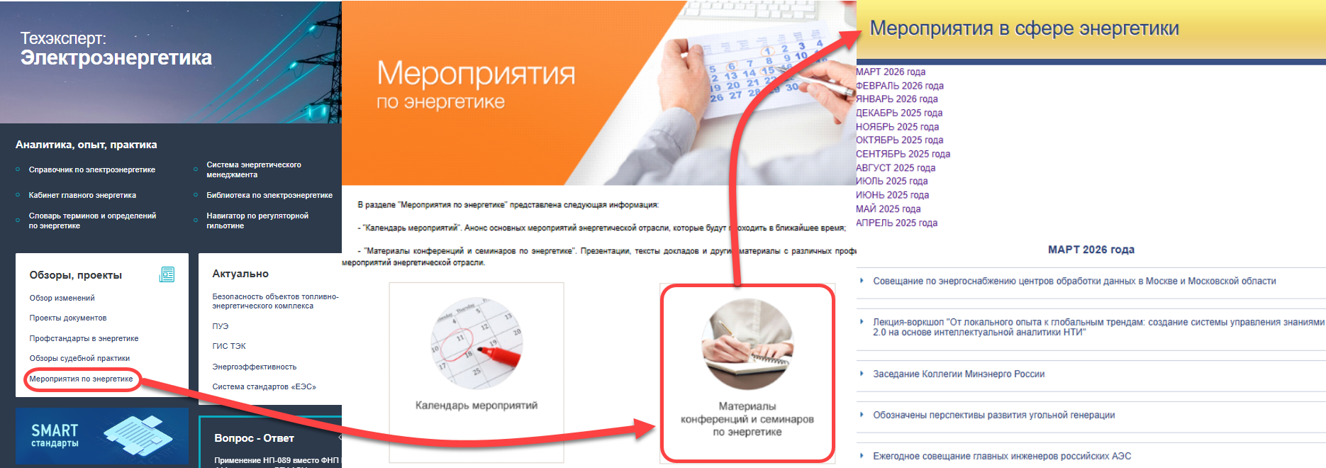 Не пропустить важные изменения в энергетической отрасли и регулярно обновлять знания поможет сервис «Мероприятия по энергетике», представленный в системах «Техэксперт: Энергетика. Премиум», «Техэксперт: Электроэнергетика» и «Техэксперт: Теплоэнергетика». В нем можно найти анонс и календарь крупнейших мероприятий отрасли, которые будут проходить в ближайшее время, а также ознакомиться с презентациями и докладами круглых столов.