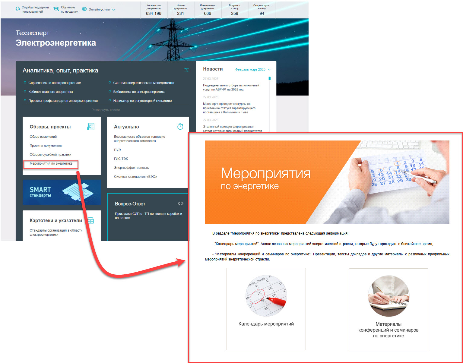 Не пропустить важные изменения в энергетической отрасли и регулярно обновлять знания поможет сервис «Мероприятия по энергетике», представленный в системах «Техэксперт: Энергетика. Премиум», «Техэксперт: Электроэнергетика» и «Техэксперт: Теплоэнергетика». В нем можно найти анонс и календарь крупнейших мероприятий отрасли, которые будут проходить в ближайшее время, а также ознакомиться с презентациями и докладами круглых столов.