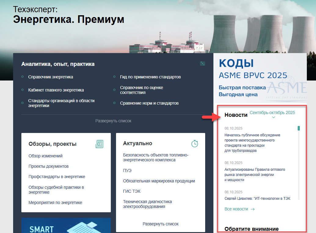 Быть в курсе последних новостей в энергетической отрасли поможет новостная лента, представленная в системах «Техэксперт: Энергетика. Премиум», «Техэксперт: Электроэнергетика», «Техэксперт: Теплоэнергетика». А в разделе «Обратите внимание» эксперты собирают для вас информацию о главных новостях и событиях месяца!