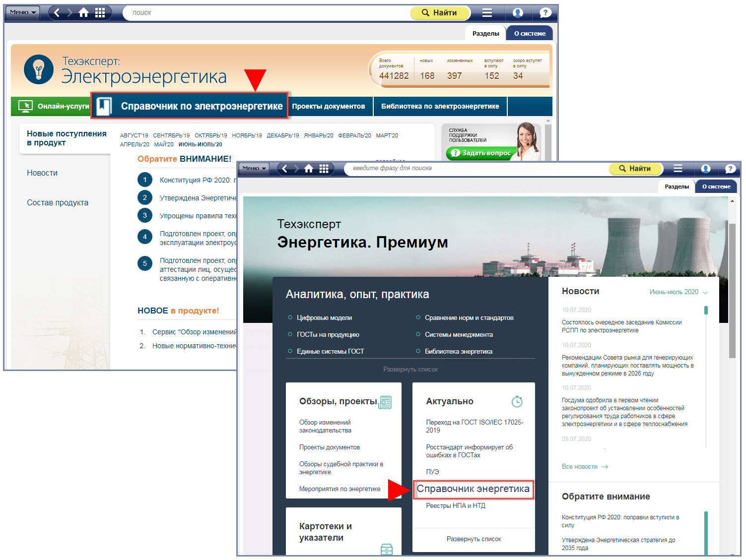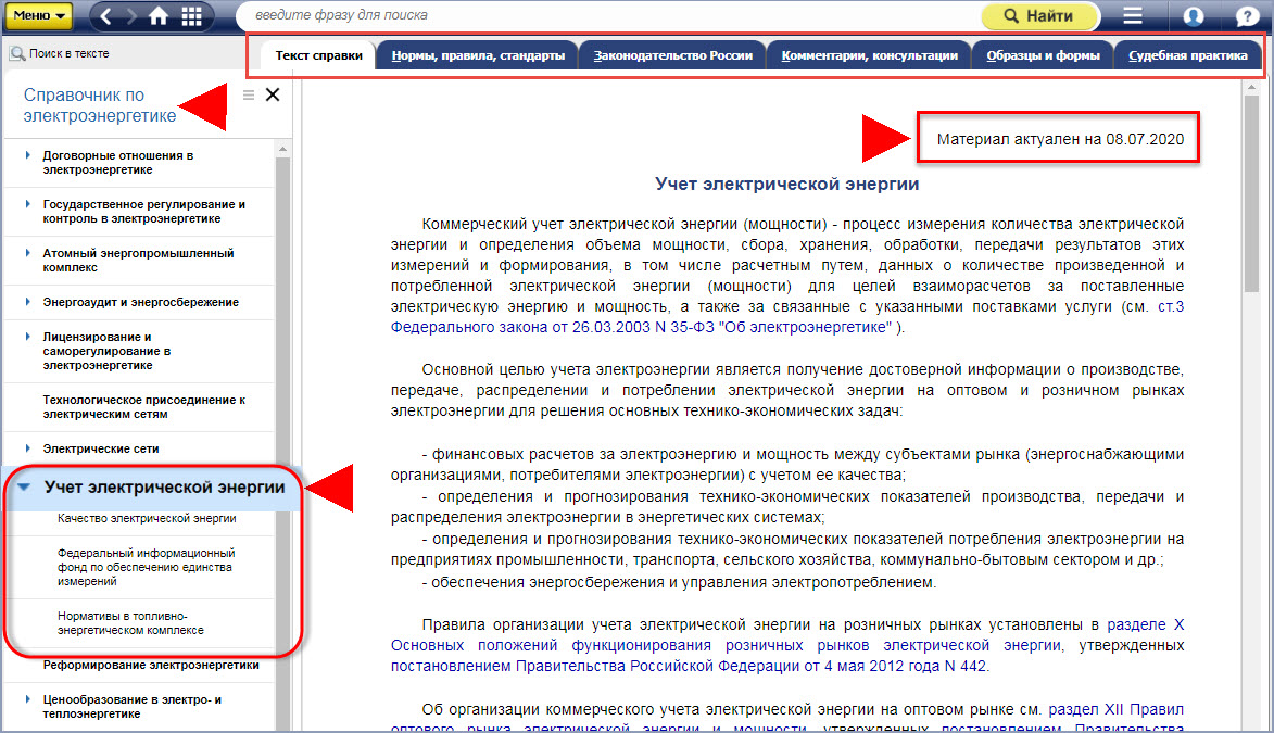 Как перейти к материалу? «Учет электрической энергии» — это отдельный раздел в «Справочнике по электроэнергетике», который находится на главной странице систем «Техэксперт» для энергетики.