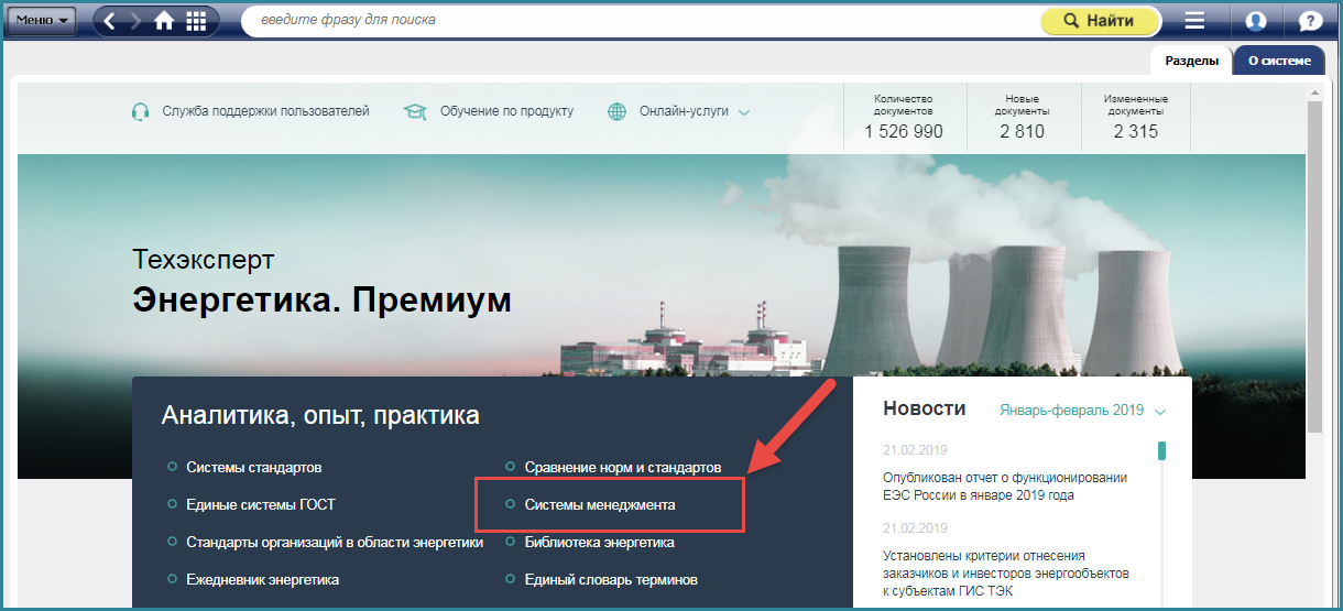 Перейти к материалам «Система энергетического менеджмента» вы можете с Главной страницы продуктов Техэксперт «Энергетика. Премиум», «Нормы, правила, стандарты», «Нефтегазовый комплекс», «Машиностроительный комплекс», «Металлургический комплекс» через сервис «Системы менеджмента», где представлены переходы по интересующим направлениям.