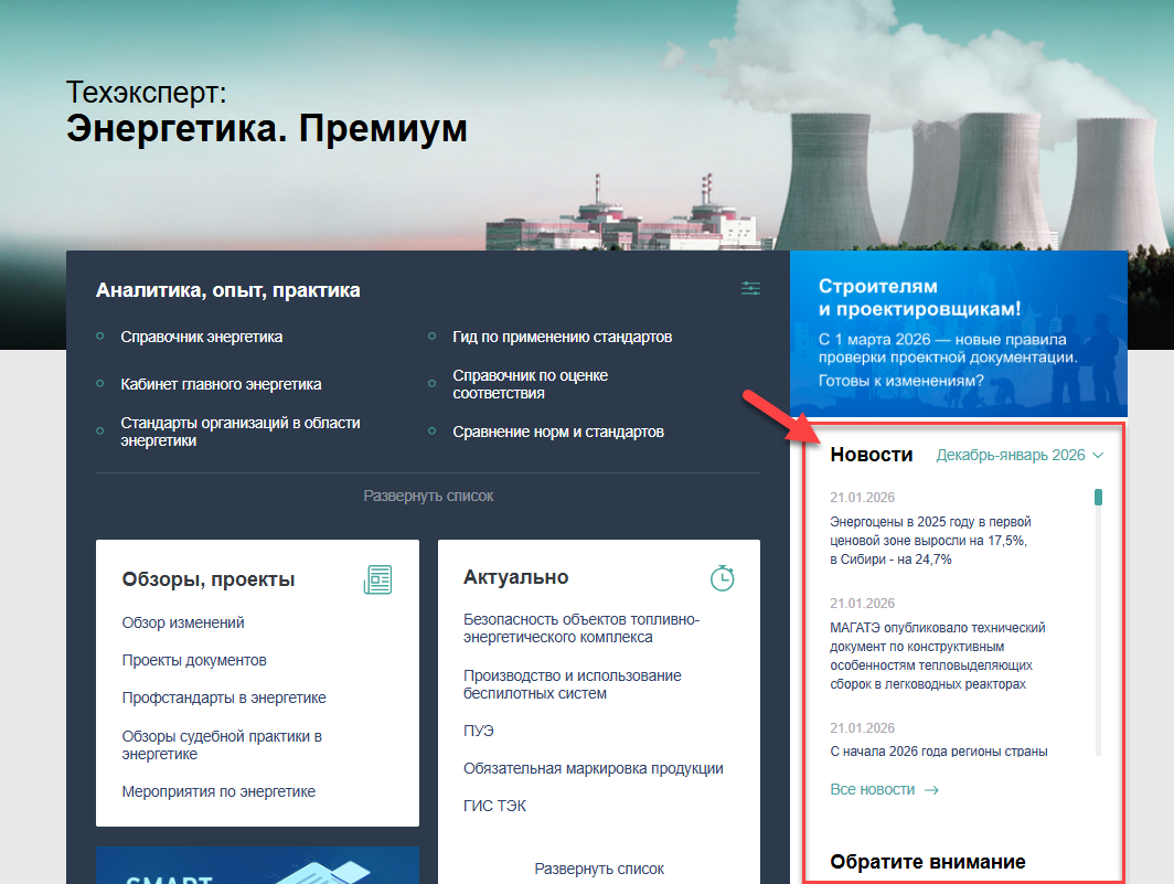 Быть в курсе последних новостей в энергетической отрасли поможет новостная лента, представленная в системах «Техэксперт: Энергетика. Премиум», «Техэксперт: Электроэнергетика», «Техэксперт: Теплоэнергетика». А в разделе «Обратите внимание» эксперты собирают для вас информацию о главных новостях и событиях месяца!