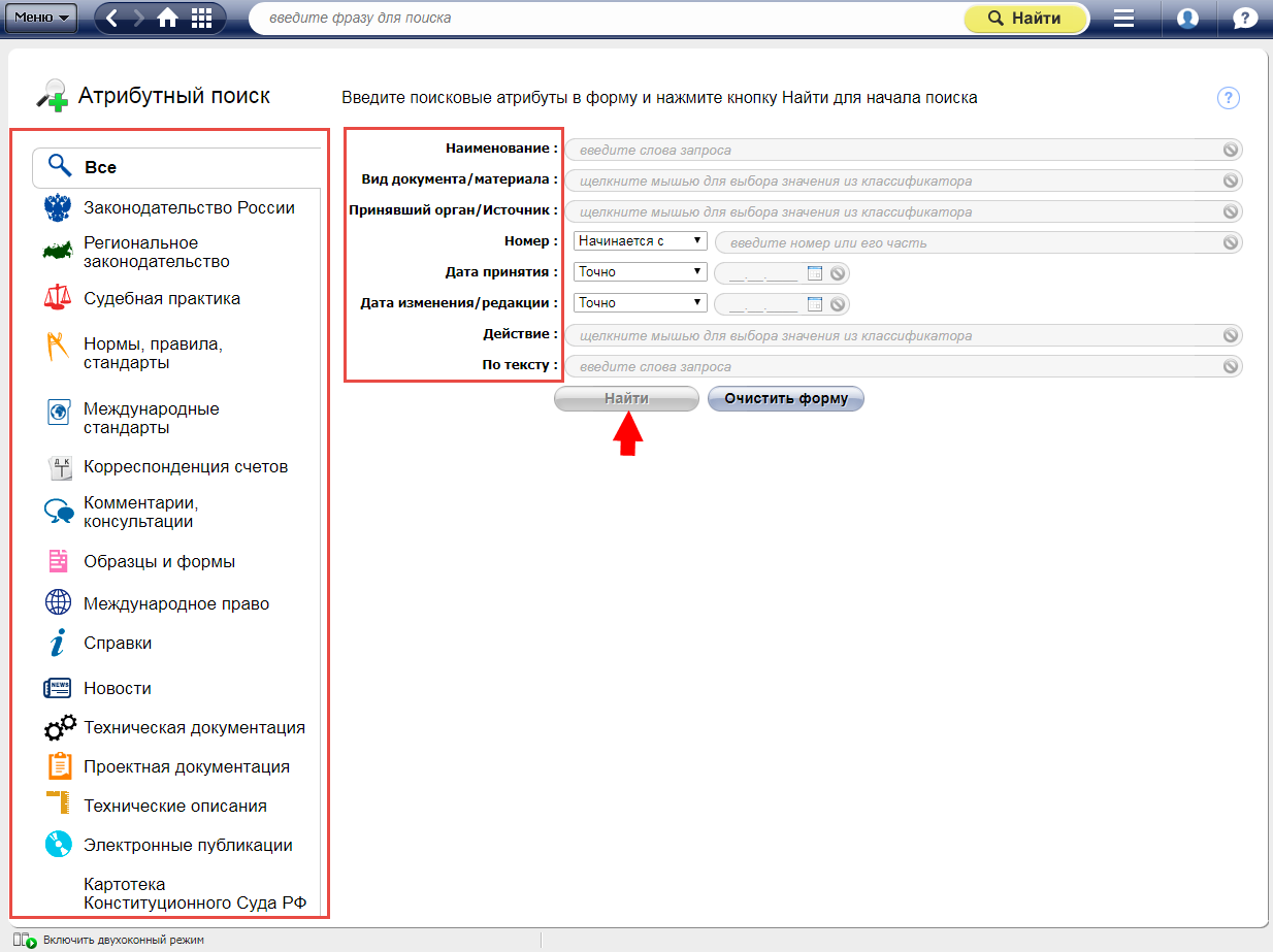 Данный вид поиска позволяет создать максимально подходящую подборку материалов для решения задачи. Заполните все известные поля в удобной форме атрибутов и получите детализированный список документов, соответствующий выбранным критериям. Чем больше данных о документе вам известно, тем точнее будут результаты поиска.