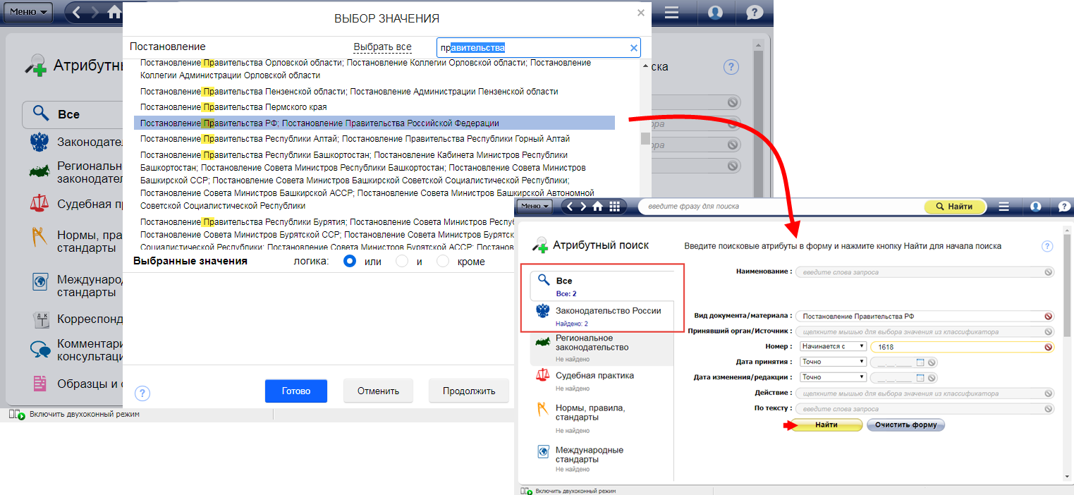 Поиск по атрибутам позволяет очень быстро найти нужную информацию по определенным параметрам. Он сократит количество найденных документов в результатах поиска. Например, если вам известна лишь приблизительная дата принятия документа, то вы можете задать определенный временной интервал, и тогда в результатах поиска отобразятся документы, даты принятия которых попадают в вышеуказанный отрезок времени. Также данный поиск незаменим, если вам необходимо найти документы по нескольким атрибутам одновременно: