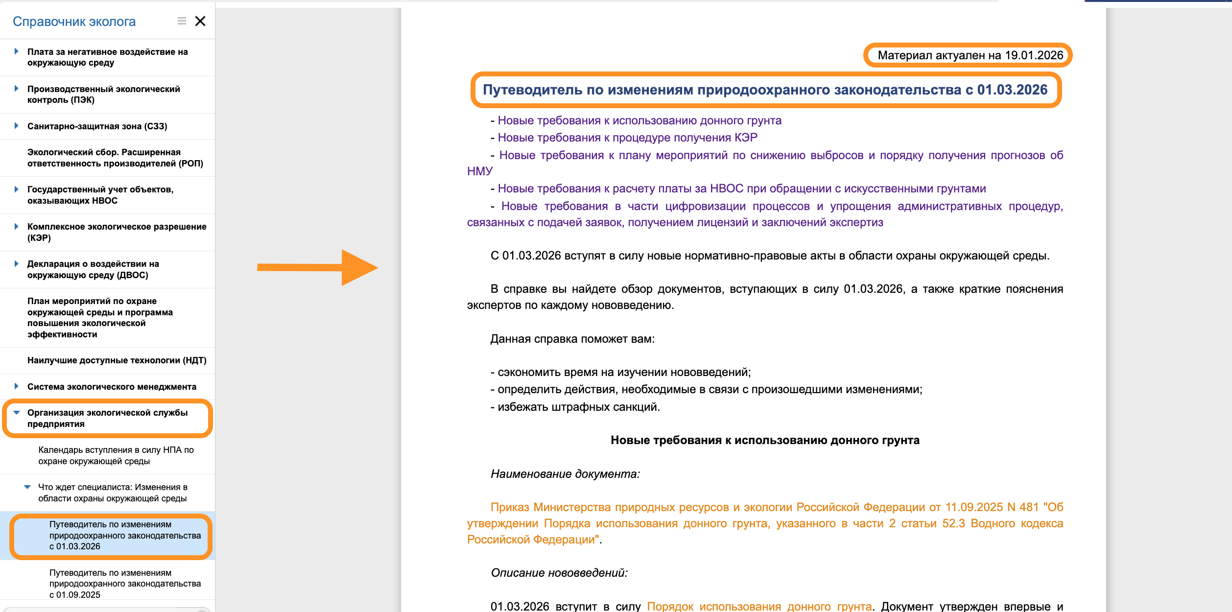 Чтобы вы могли системно и без лишних затрат разобраться во всех нововведениях, в системах «Техэксперт: Экология» подготовлен специальный материал: «Путеводитель по изменениям природоохранного законодательства с 01.03.2026».