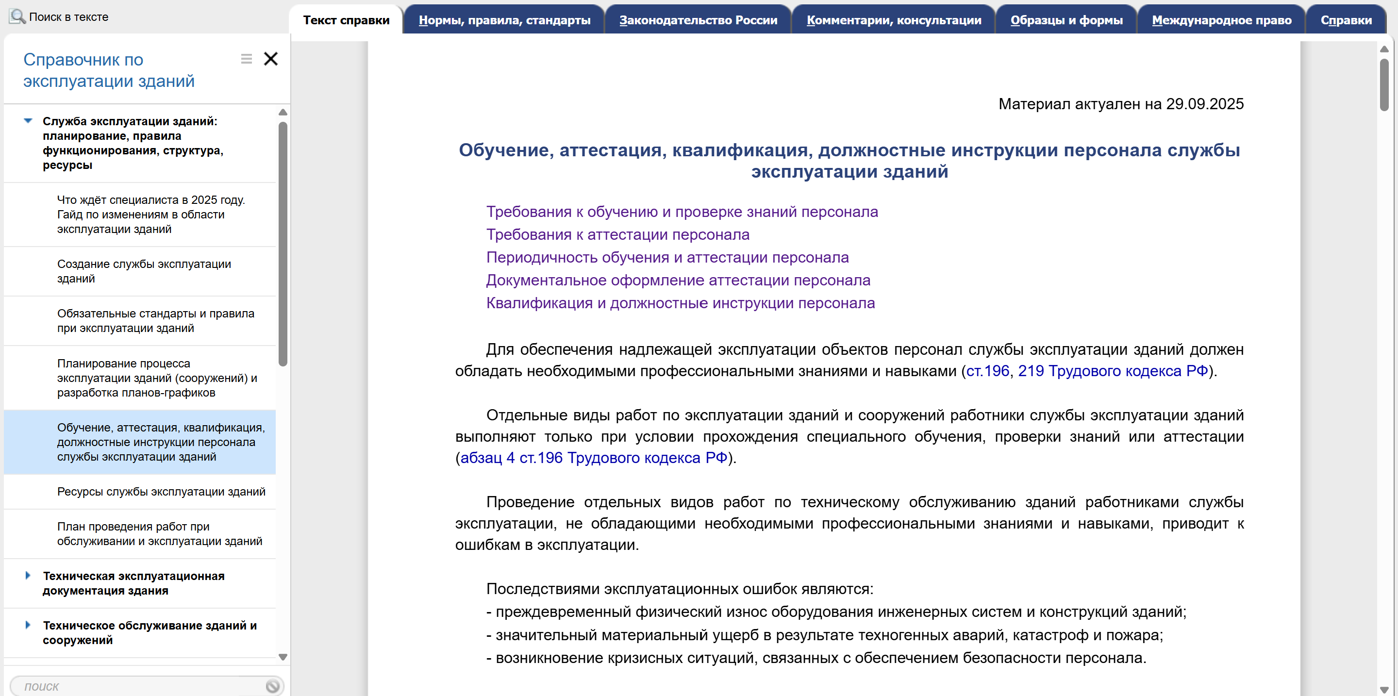2. Справочный материал «Обучение, аттестация, квалификация, должностные инструкции персонала службы эксплуатации зданий»