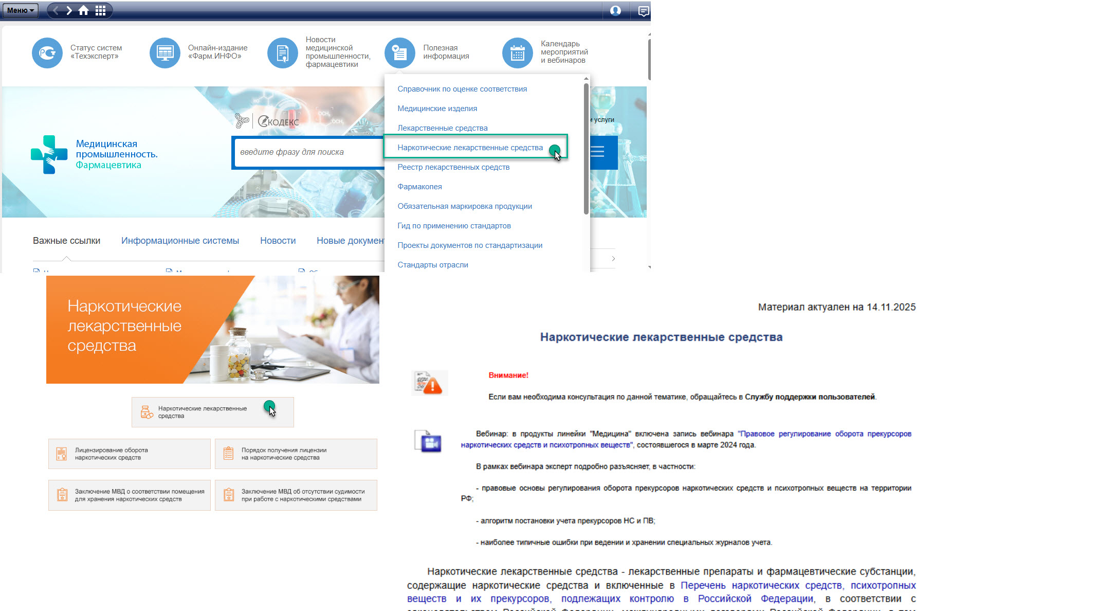 Работа с наркотическими лекарственными средствами требует безупречного знания постоянно меняющегося законодательства. В системе «Техэксперт: Медицинская промышленность. Фармацевтика» для решения этих задач создан специальный раздел «Наркотические лекарственные средства». Это ваш центральный узел доступа к критически важной информации, которая обеспечивает не только оперативность работы, но и полную правовую безопасность. В разделе собраны уникальные справки, которые станут надежным ориентиром на всех этапах деятельности.