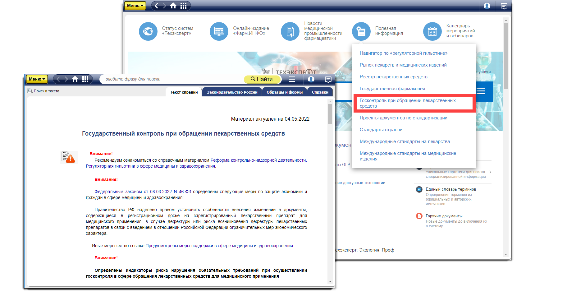 Государственный контроль осуществляется на всех стадиях жизненного цикла лекарственного средства. Особенно госконтроль важен при регистрации импортных препаратов, поскольку от успешности процедуры зависит скорость вывода лекарства на рынок. В вопросах регистрации и обращения лекарственных препаратов, в том числе ветеринарных, поможет разобраться сервис «Государственный контроль при обращении лекарственных средств» отраслевого комплекта «Техэксперт: Медицинская промышленность. Фармацевтика». В сервисе содержится информация о: