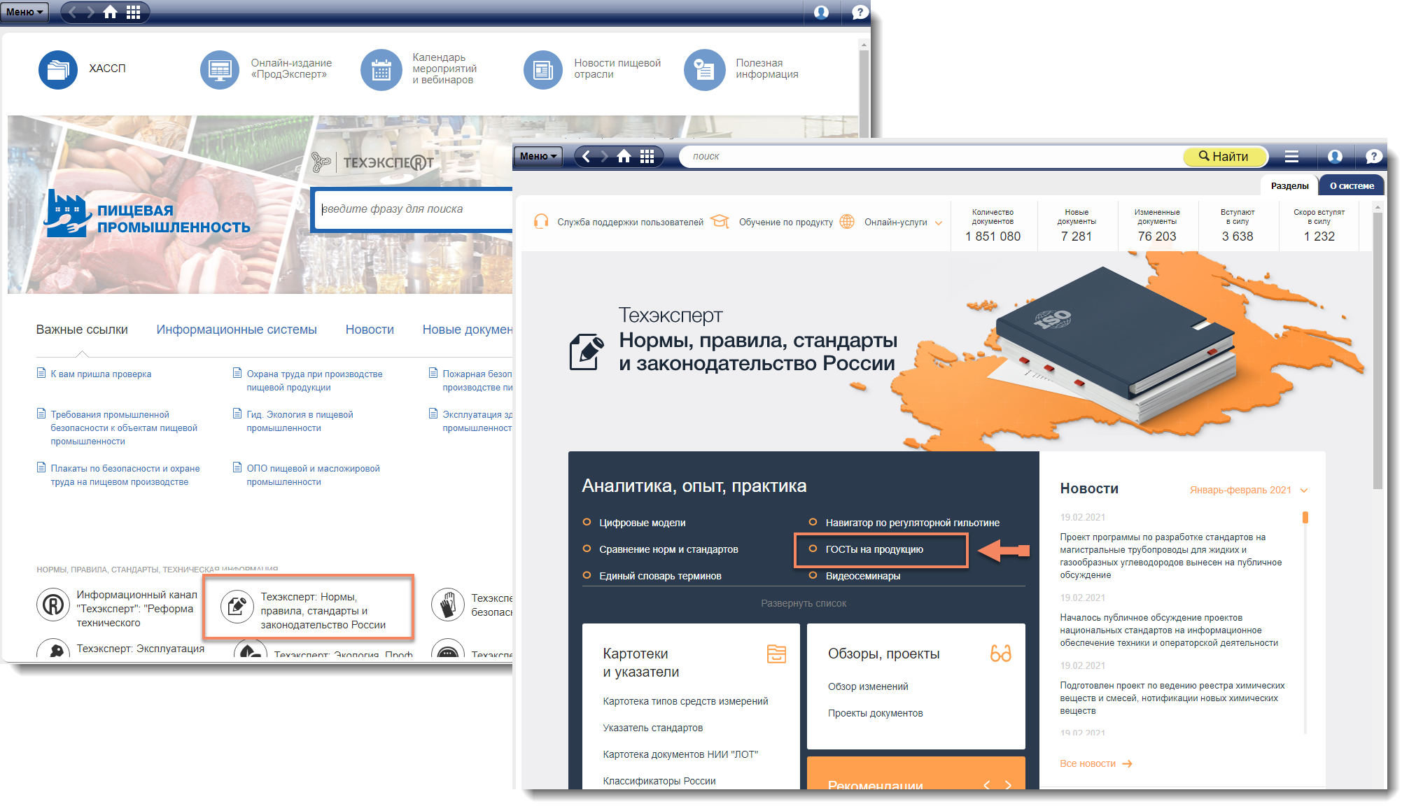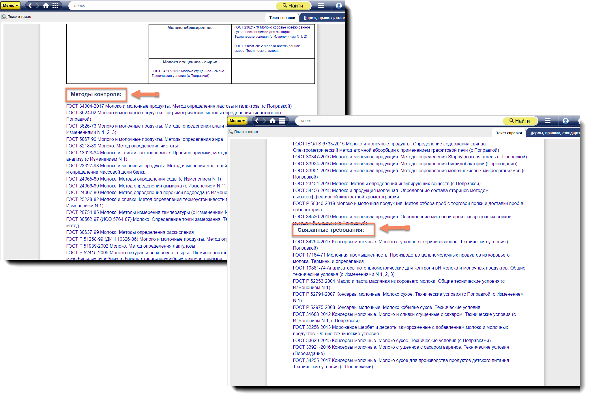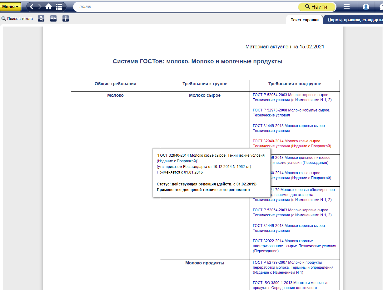 Сервис «ГОСТы на продукцию» позволит получить подборку действующих ГОСТов на интересующий вид продукции. Найти сервис вы сможете открыв главную страницу комплекта «Пищевая промышленность» перейдя к системе «Нормы, правила, стандарты».