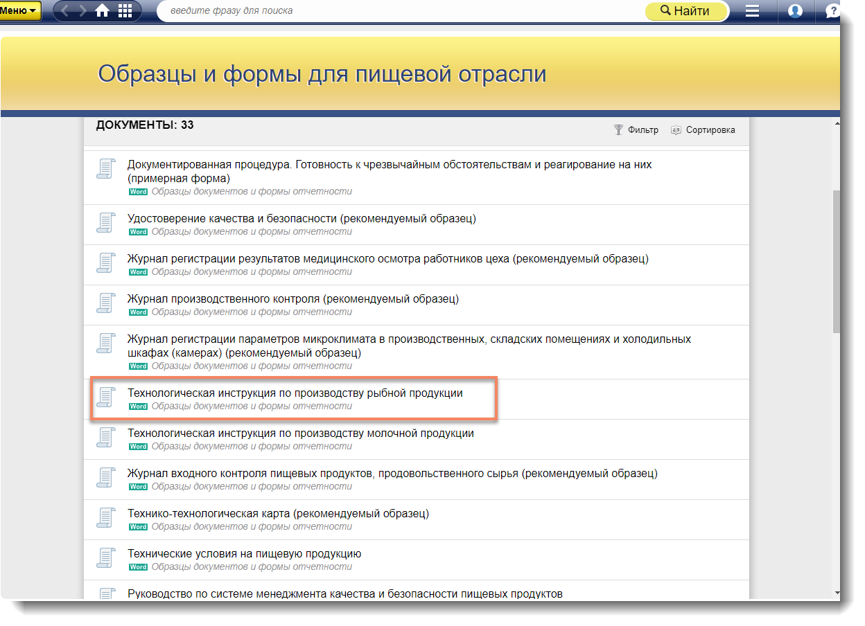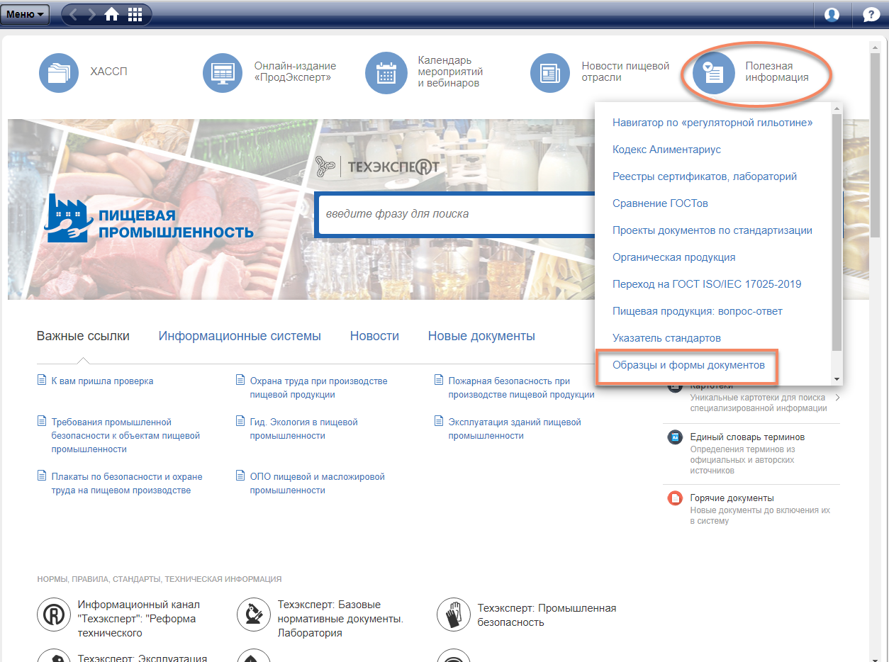 На главной странице «Пищевая промышленность» в полезной информации вы найдёте «Образцы и формы документов».