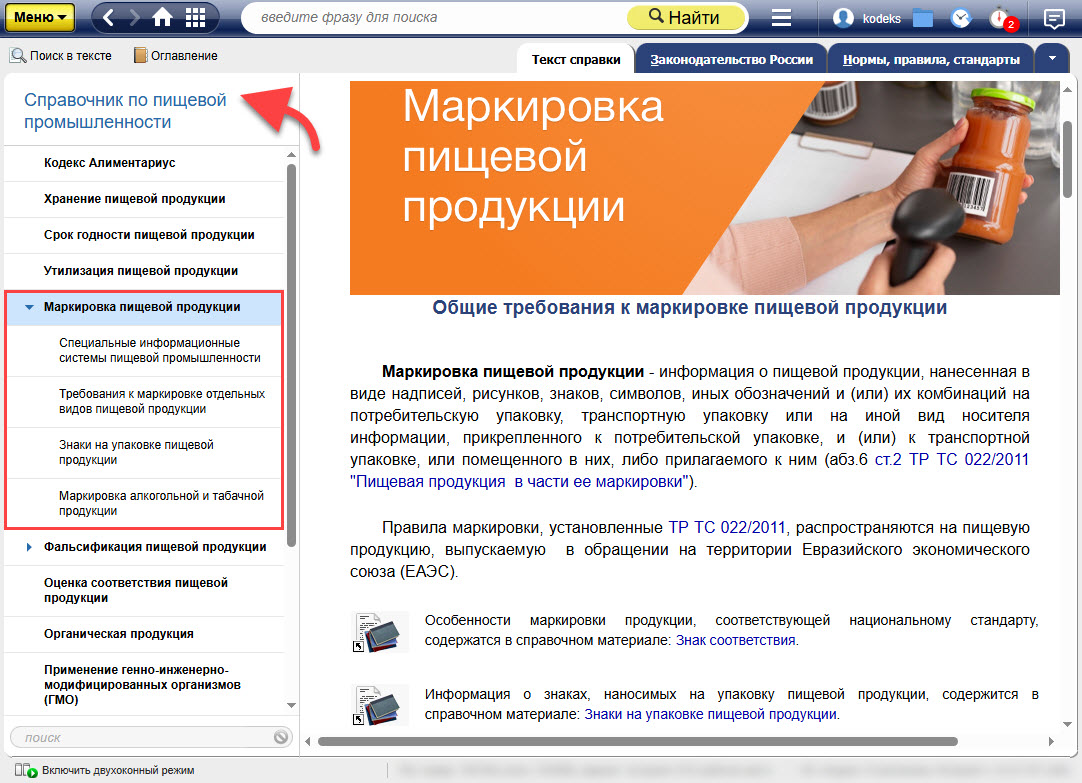 Маркировка пищевой продукции должна содержать ряд важных сведений, в том числе влияющих на безопасность пищевой продукции для конечного потребителя. Учесть все нюансы и не запутаться в обязательных и дополнительных данных, которые необходимо указать, достаточно сложно. В этом поможет справочный контент комплекта «Техэксперт: Пищевая промышленность». Пользователям комплекта доступны сразу несколько справочных материалов, которые помогут всесторонне изучить вопрос и соблюсти все необходимые требования к маркировке.