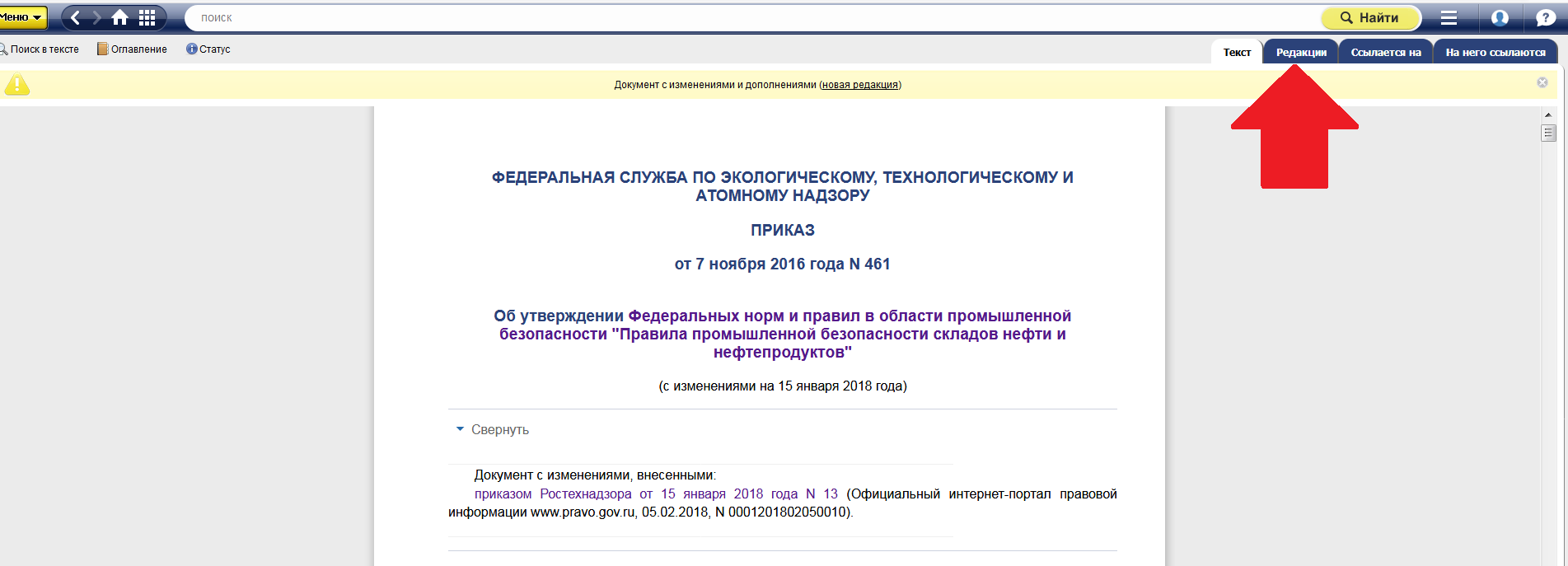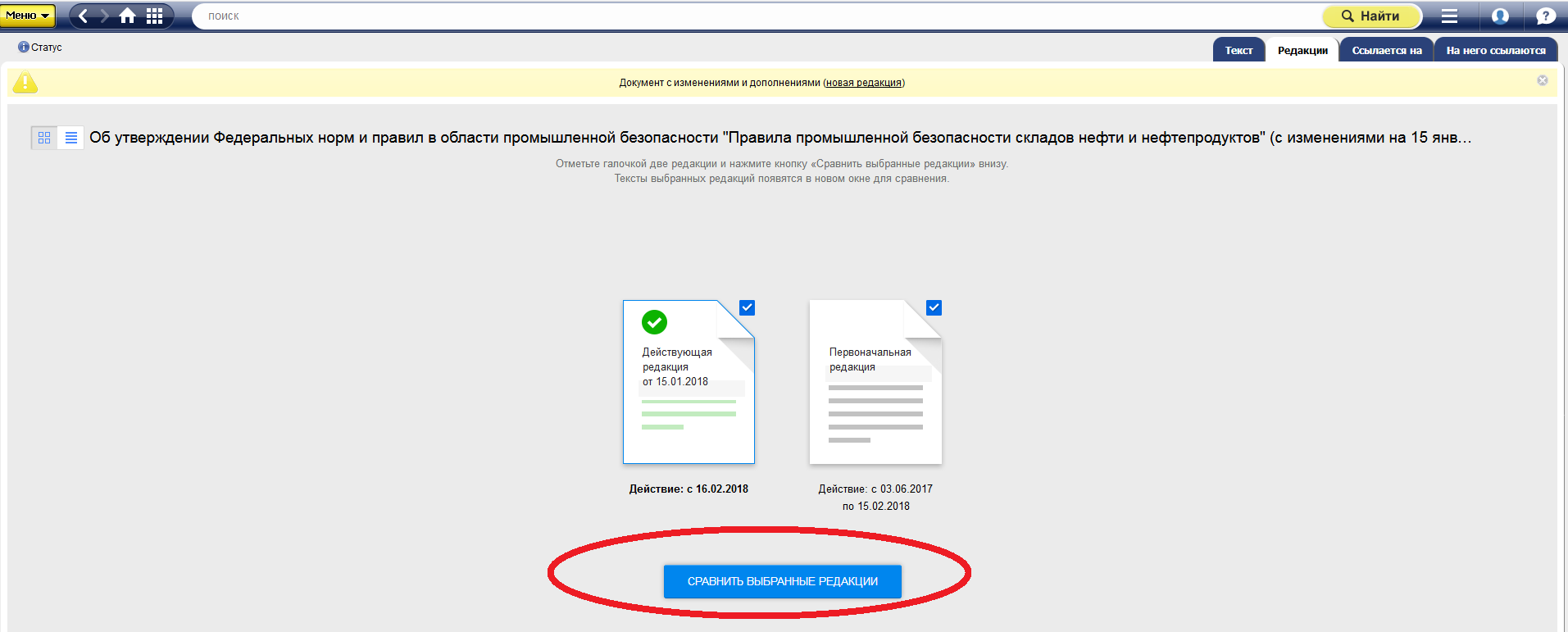 Оба документы вы можете легко найти в системе через запрос в интеллектуальном поиске. Проанализируйте изменения, которые произошли в приказе Ростехнадзора от 7 ноября 2016 года N 461 с помощью сервиса «Сравнение редакций».