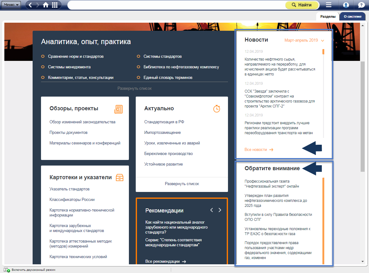 — На главной странице системы «Нефтегазовый комплекс» есть блок «Аналитика, опыт, практика», где вы найдете кнопку «Сравнения норм и стандартов»;