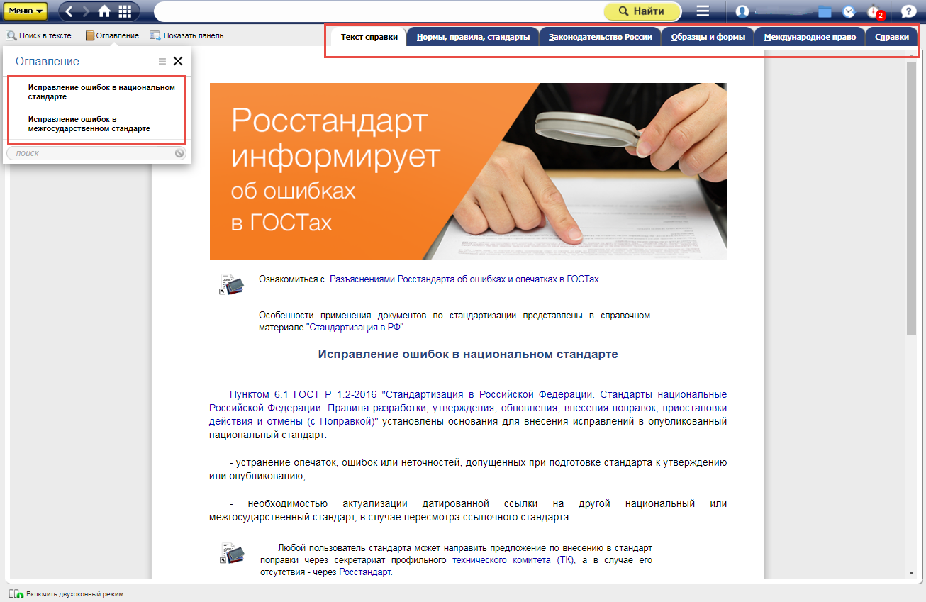 В справочном материале можно ознакомиться с подборкой разъяснений Росстандарта об ошибках и опечатках в ГОСТах, актуальным перечнем Технических комитетов по стандартизации, а также процедурой исправления ошибок в национальных и межгосударственных стандартах.