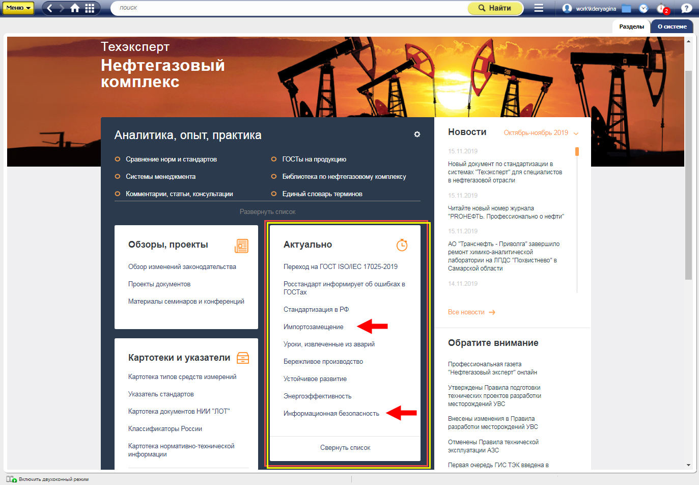 Материалы доступны с главной страницы системы «Техэксперт: Нефтегазовый комплекс», а именно в блоке «Актуально».
