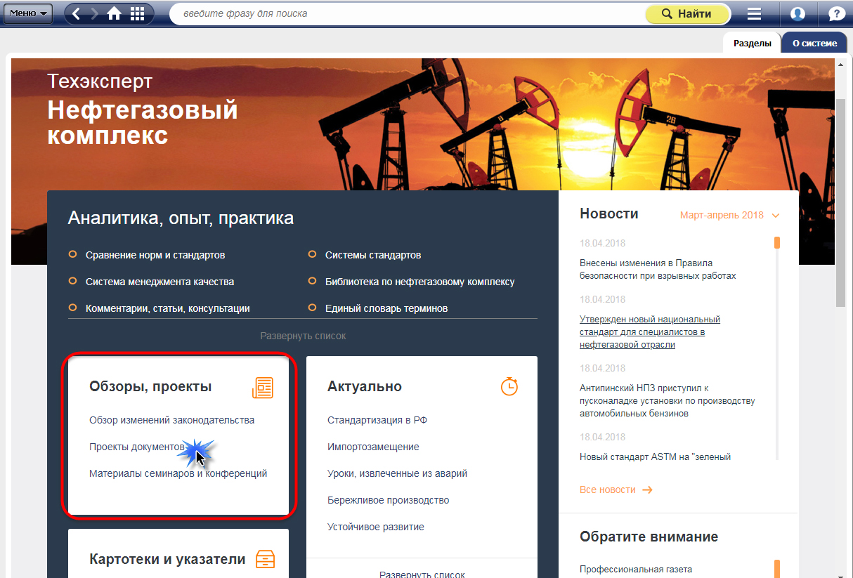 Проекты стандартов и документов можно с легкостью найти через Интеллектуальный поиск. Например, при формировании запроса «разрабатывае...» формируется подсказка, при выборе которой вы сразу попадаете на главную страницу сервиса.