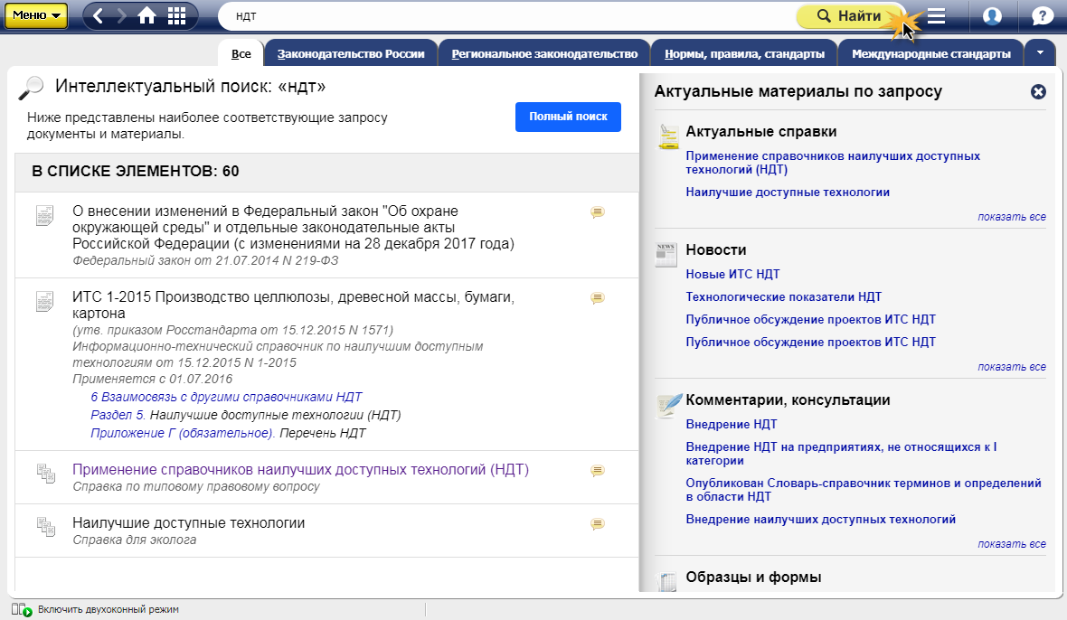 Одной из главных целей является внедрение предприятиями наилучших доступных технологий (НДТ) на основании справочников НДТ в различных областях. На сегодняшний день все справочники НДТ изданы (51 справочник), они доступны в системах «Техэксперт».