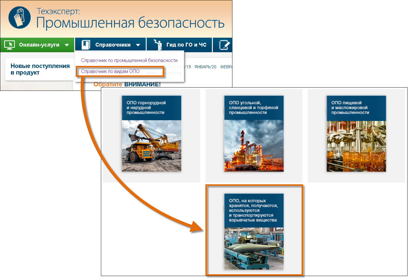 Материалы расположены в «Справочнике по промышленной безопасности» под кнопкой «Справочники» на синей панели.