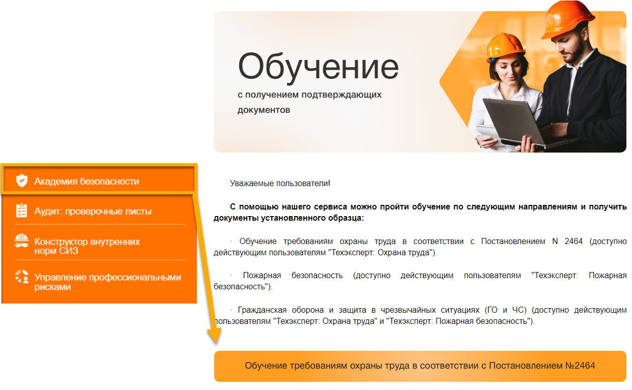 - В системе «Техэксперт. Охрана труда» реализован сервис «Академия безопасности», благодаря которому пользователи могут пройти бесплатное дистанционное обучение по охране труда по 5 модулям на выбор, включая модуль «Обучение по оказанию первой помощи пострадавшим».