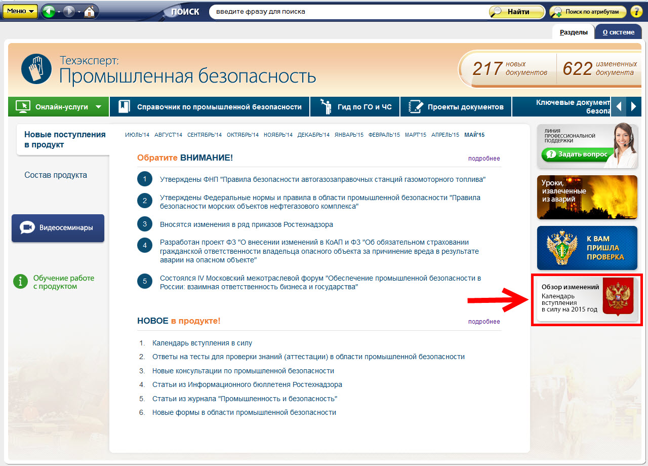 Чтобы всегда оперативно реагировать на изменения, пользуйтесь «Календарем вступления в силу» в системах «Техэксперт: Охрана труда», «Техэксперт: Промышленная безопасность» и «Техэксперт: Пожарная безопасность».