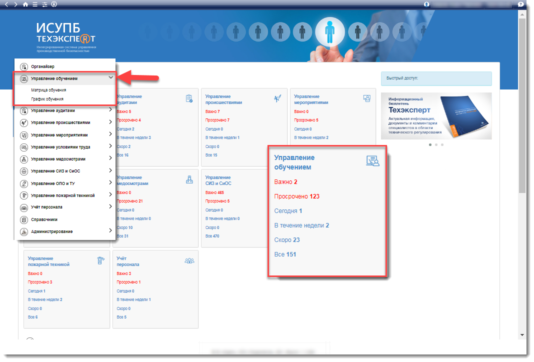 Организовать обучение безопасным методам и приемам выполнения работ, а также проверку знаний по охране труда специалистам поможет модуль «Управление обучением» интегрированной системы производственной безопасности ИСУПБ «Техэксперт». В модуле реализован ряд функций, направленных на выполнение задач по планированию, проведению и оформлению результатов обучения.
